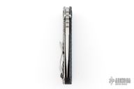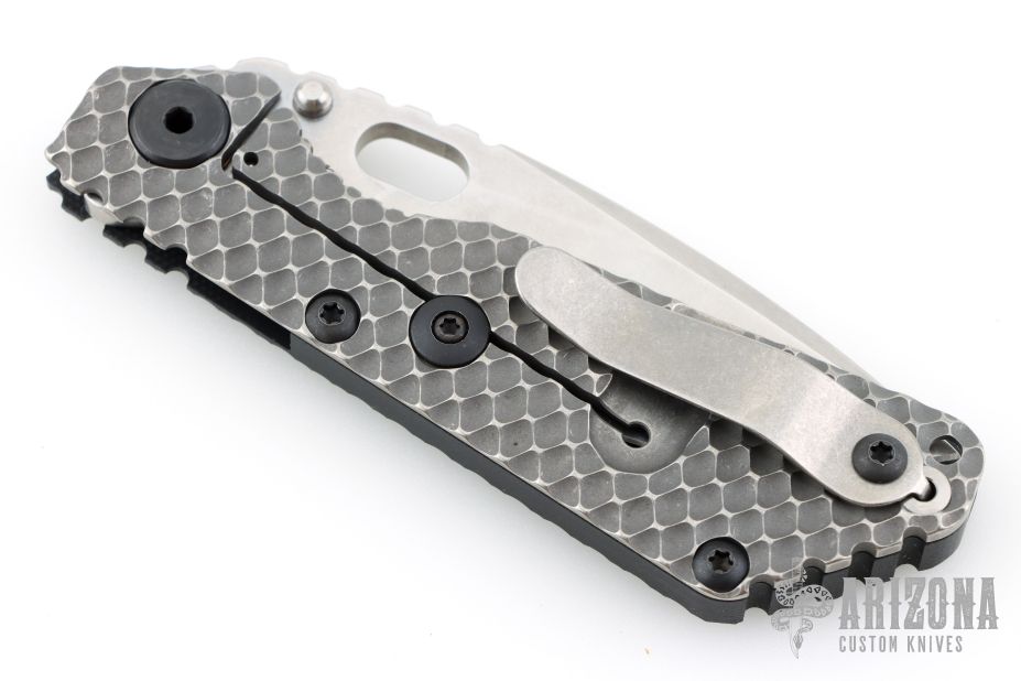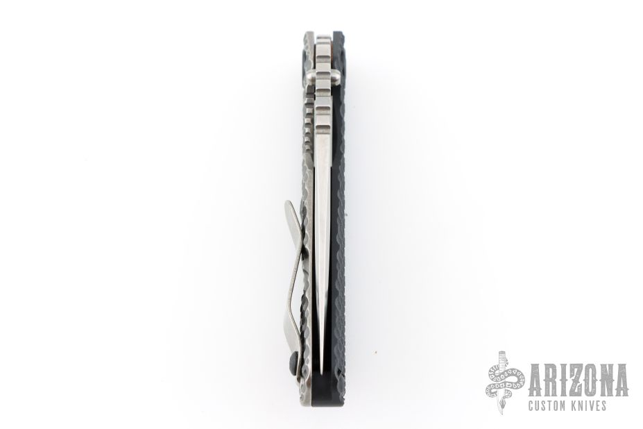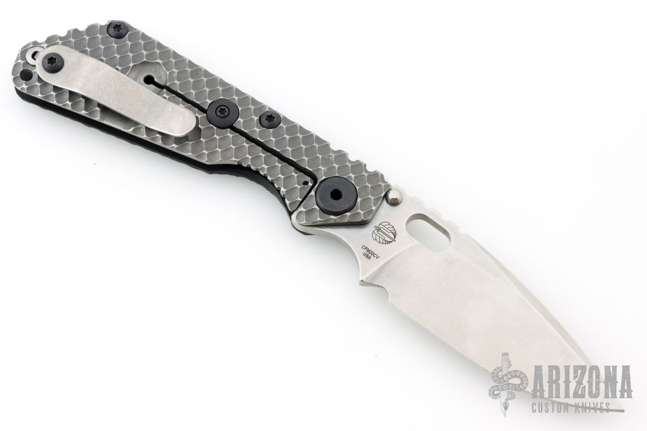 This SNG DGG by M Strider has a stonewashed blade with dual thumb studs, thumbhole, and notched thumbrest. Handle is black G-10 and bead blasted titanium "Gunner Grip", lockbar stabilizer, and titanium tip up clip. Nice detent, lockup and blade seating. New condition.