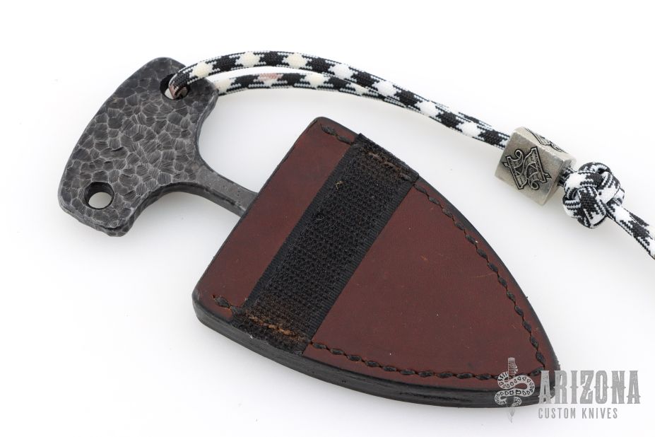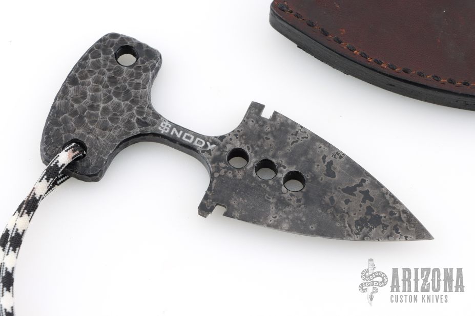 This Push Dagger by Mike Snody features a darkened chisel gound double-edged blade with .247" blade stock and 1.652" blade depth,. full tang construction with textured grip. Comes with a brown leather sheath. Excellent condition.