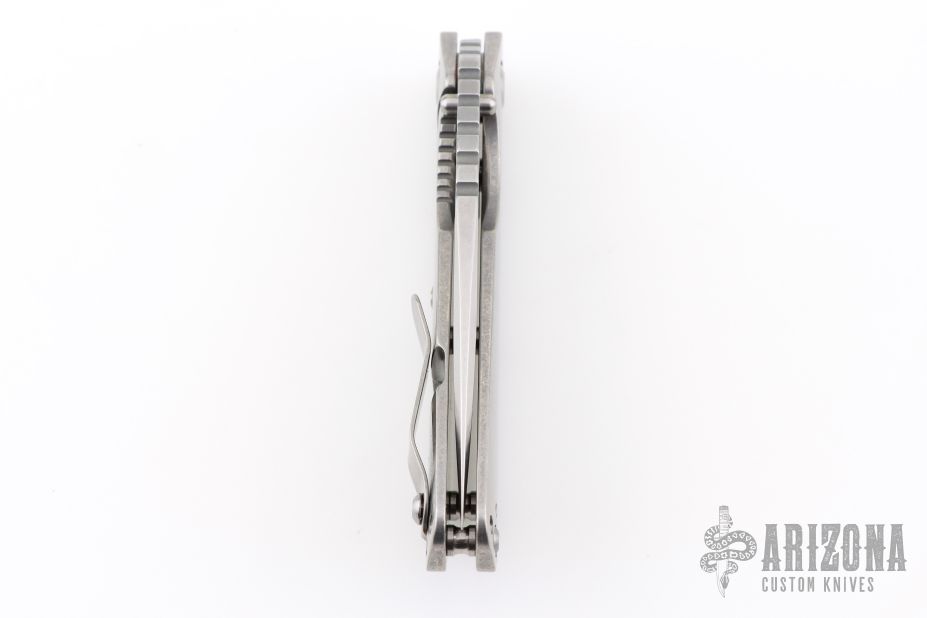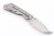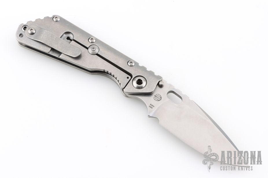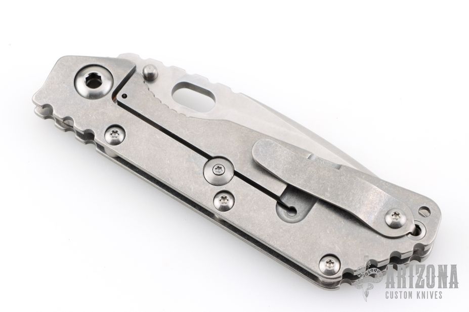 This SMF CC by Strider Knives features a stonewashed blade and smooth carbon fiber and a stonewashed titanium handle and matching tip up titanium clip. Notches on thumbrest, rear of handle, and early lockup. Includes Hinderer "Lock Bar Stabilizer" for maximum reverse lock retention. New condition.