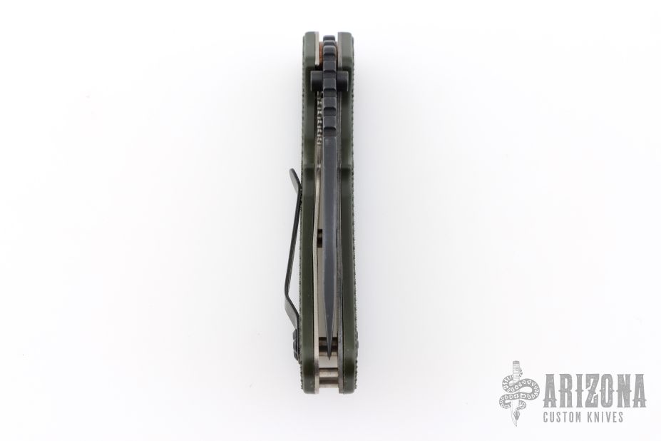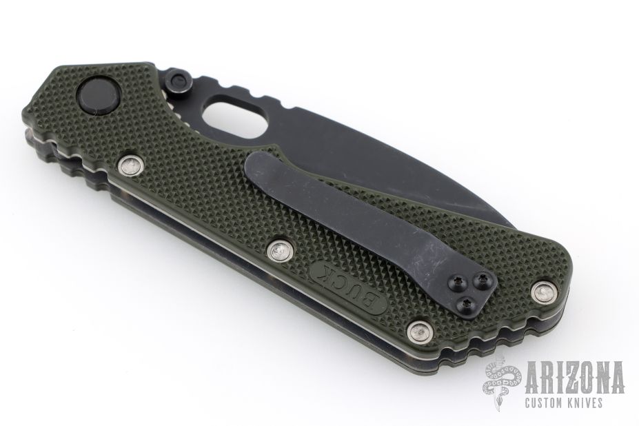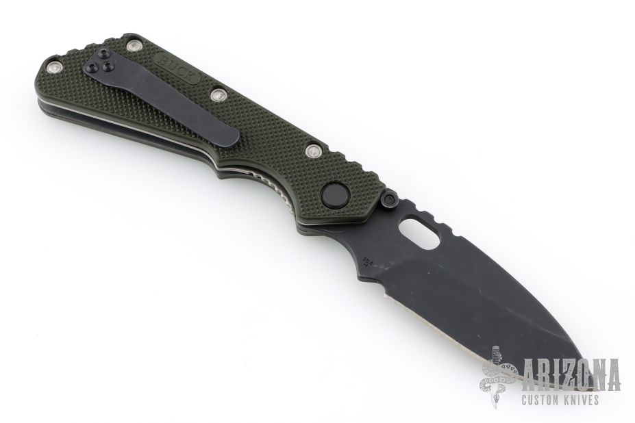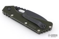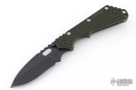 This is a Buck made Strider SNG has a black blade with notched thumbrest, and thumbhole. The handle has textured green FRN scales, stainless steel liners and reversible tip up carry clip. Notching on thumbrest area and front/rear of handle provide a solid grip. Discontinued. Excellent condition. Comes with original box and papers.