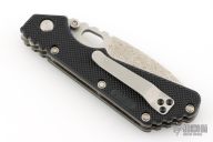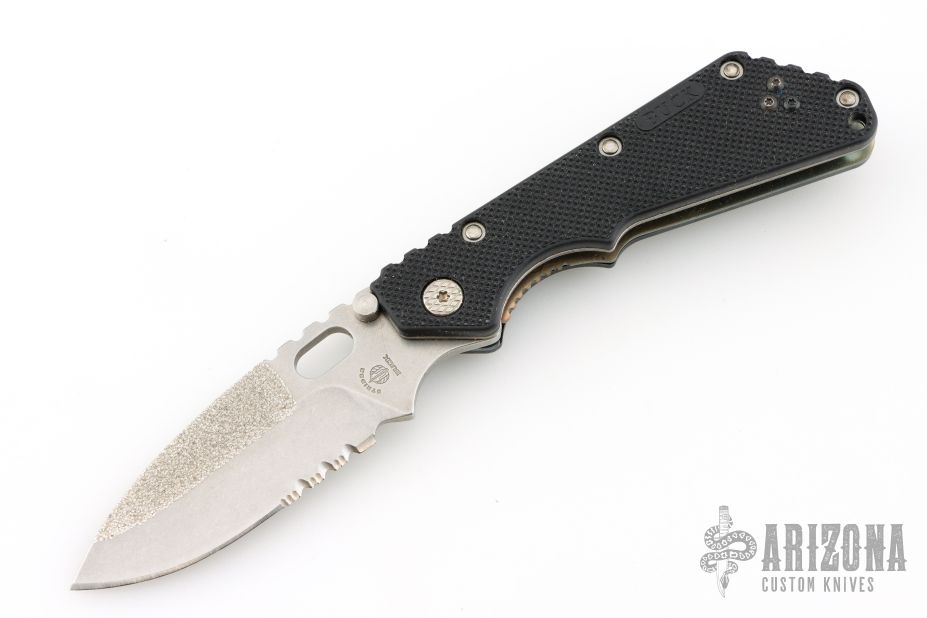 This is a Buck made Strider SNG with a partially serrated blade and black FRN scales, stainless steel liners, stainless steel tip up reversible carry clip. Notched thumbrest area and front/rear of handle provide a solid grip. Good lockup, detent and seating. Comes with original box and papers. Excellent condition.