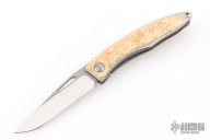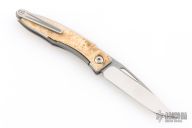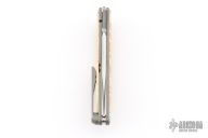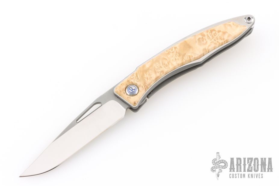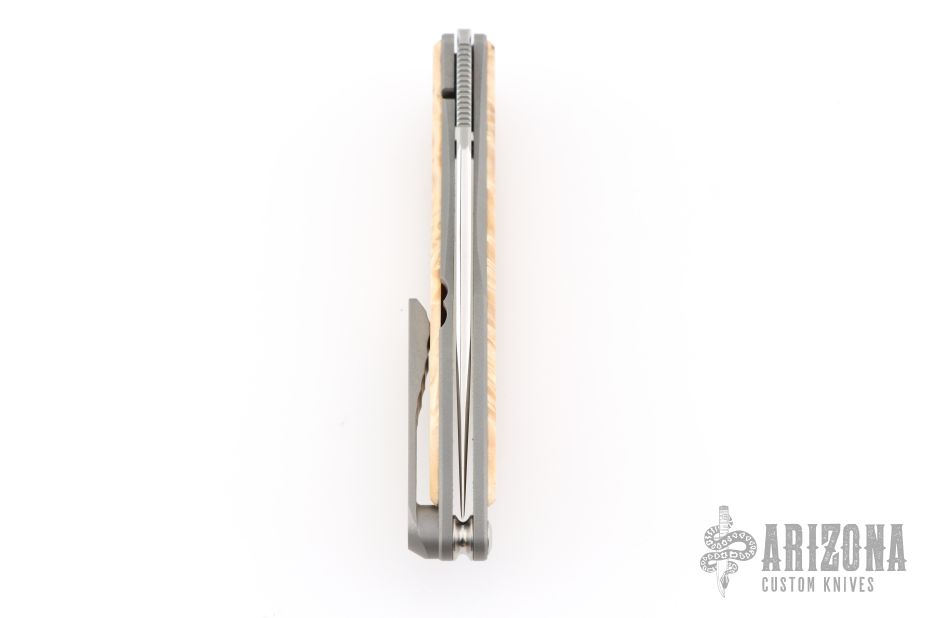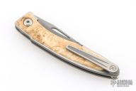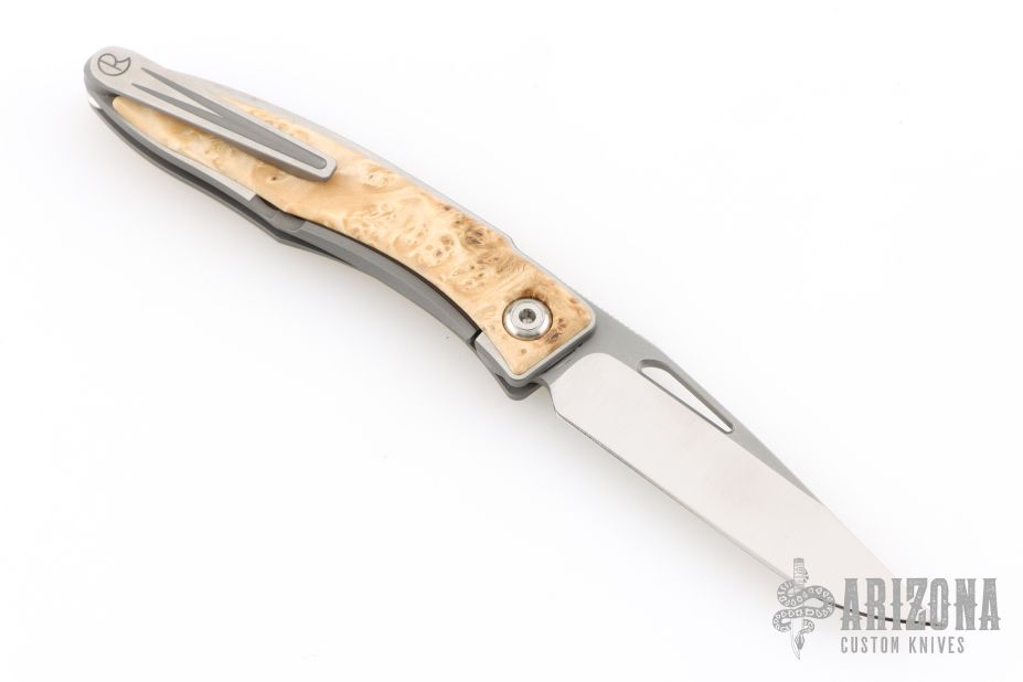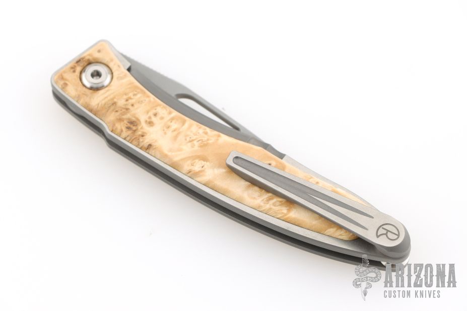 This Mnandi by Chris Reeve Knives has a satin finished blade with notched thumbrest and nail nick. The handle has a bead blasted and satin finished titanium frame with box elder burl inlays. Titanium clip, tip up carry. Comes with original box, leather slip sheath and COA dated March 6, 2025. Excellent condition.
