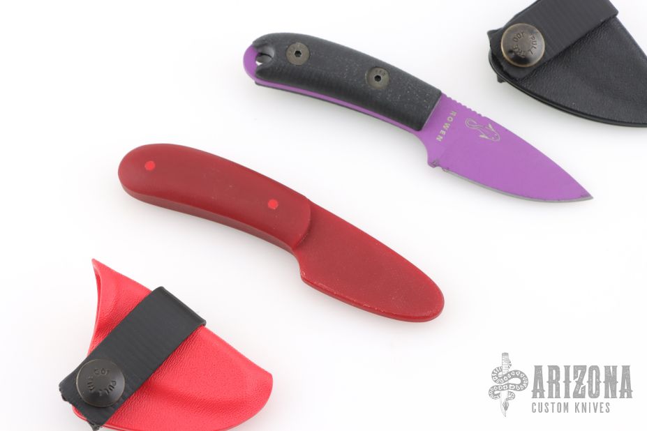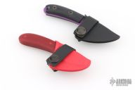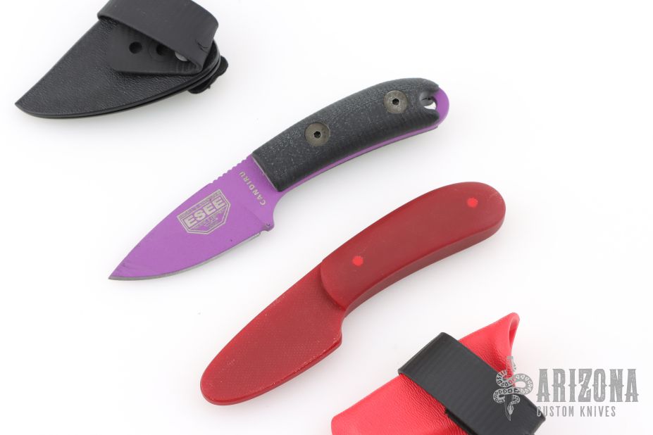 This Candiru by Esee Knives features a purple blade with a notched thumbrest, .133" blade stock and .980" blade depth, full tang construction with custom black G-10 scales from The Knife Connection. Comes with a custom Kydex sheath by Dark Star Gear. Has a few scuffs, otherwise excellent condition. Comes with a red G-10 trainer by Bladerigs with custom Kydex sheath by Dark Star Gear.