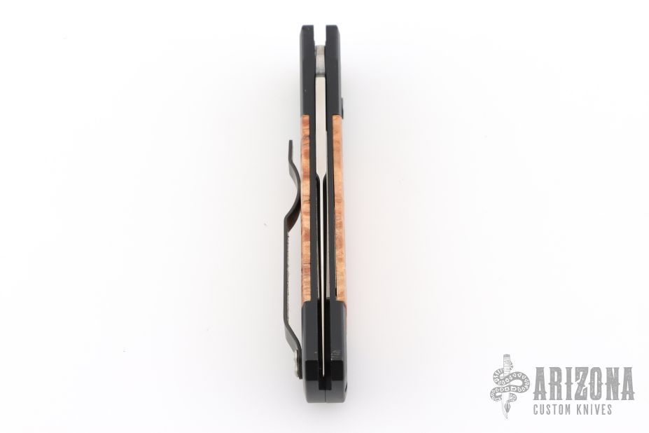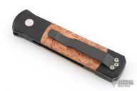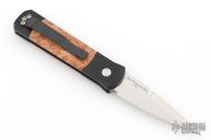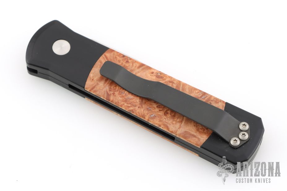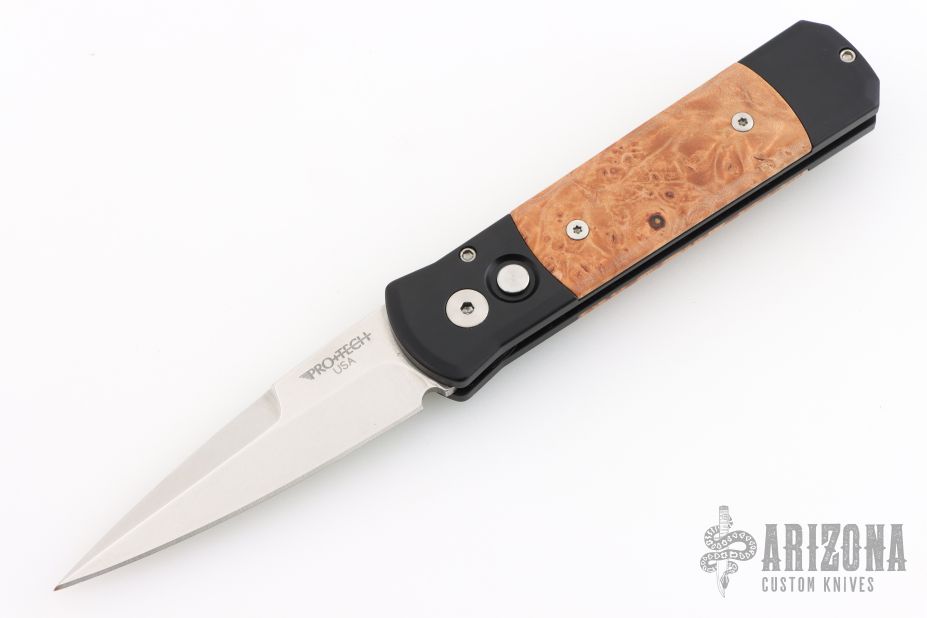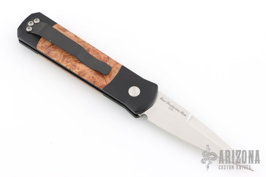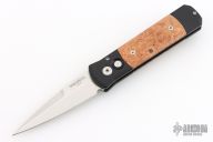 The Godson by Protech is a slightly smaller version of the Godfather. As with all Pro-Tech automatics, the most prominent functional feature is the great spring action. The handles are hand satin finished prior to anodizing and the maple burl inlays fit perfectly. The black aluminum frame and maple burl come together to make one great looking knife. The blade is stonewashed. Comes with a Pro-Tech box and papers. Excellent condition. First Production Run #019
