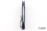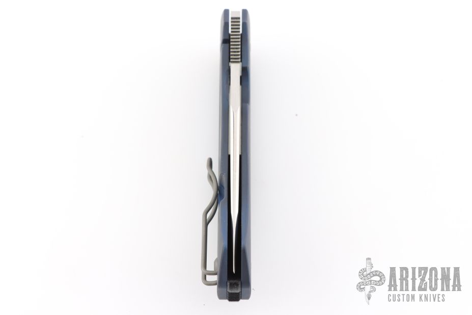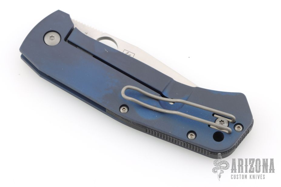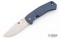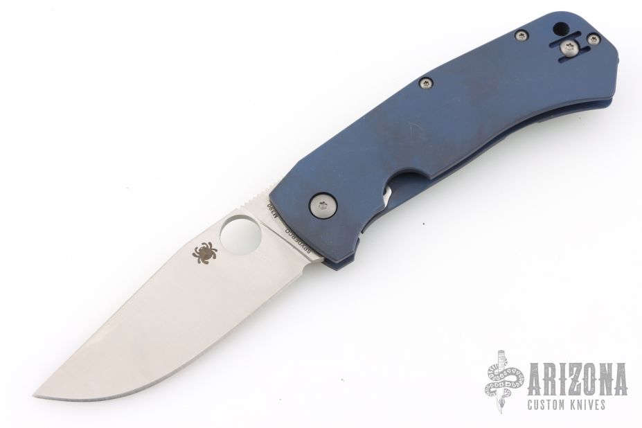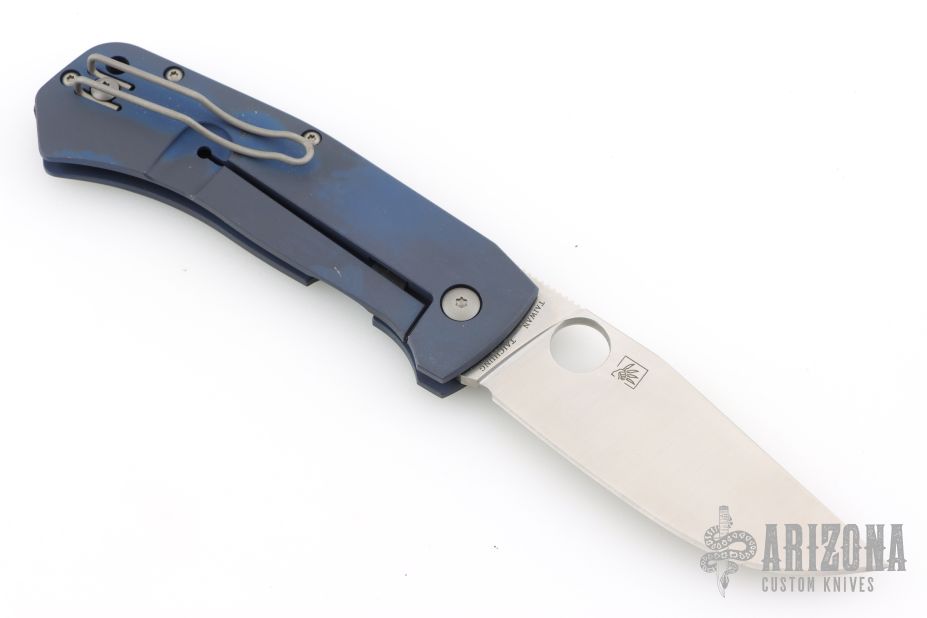 This Slysz Bowie by Spyderco features a satin finished blade with notched thumbrest and thumbhole. The handle has a blue anodized titanium frame with notched G-10 backspacer and tip up, left or right reversible clip. Nice detent, lockup and blade seating. Includes the original box, zippered case and papers. Has a couple light scuffs, otheriwse excellent condition.