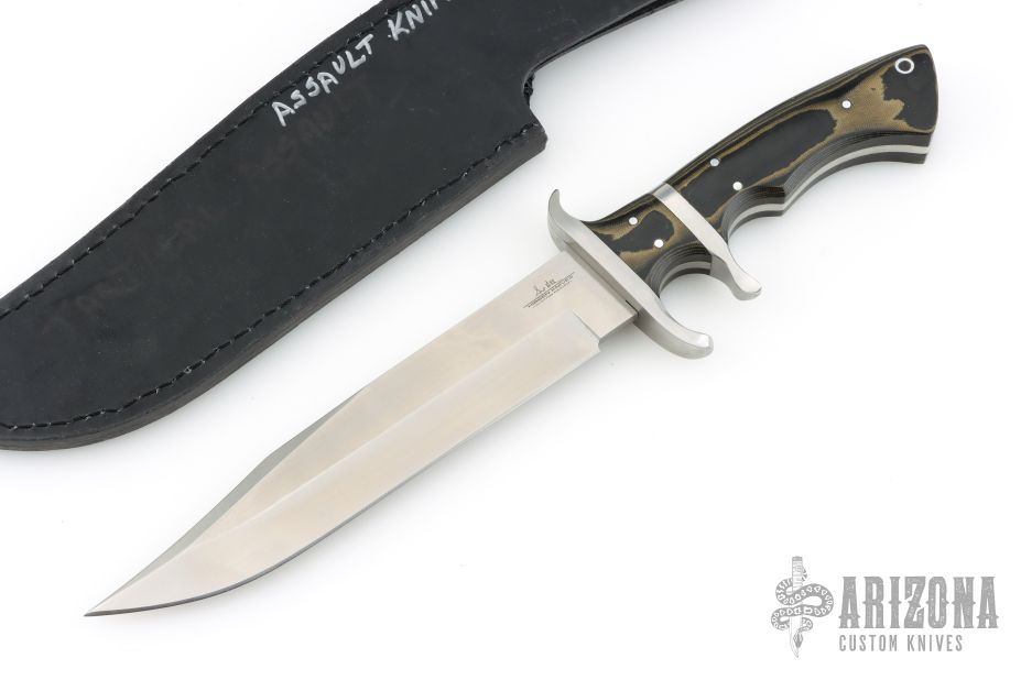 This new Hibben Assault knife combines a unique trigger-grip handle and a powerful full tang blade to make one functional, tactical knife. It offers a 7 1/2” razor-sharp, 7CR17 stainless steel, clip-point blade and a handle constructed of premium Micarta, nickelsilver pins and a nickel-silver lanyard hole. The guard, pommel and fittings are cast of stainless steel with a satin finish. This is a unique collectible that should be passed down for many future generations to enjoy. Includes a custom leather belt sheath with the Hibben Custom Design logo stamped right into the leather and a certificate of authenticity.