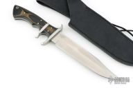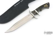 Gil Hibben lives and works in LaGrange, Kentucky. He began making knives part-time after his discharge from the Navy in 1956. He sold his first bowie knife for $45 and that sparked his long and famous career as a professional knife maker. While living in Seattle, WA after his Navy discharge, Gil worked as a machinist for Boeing Aircraft and learned a lot about metals and their properties. In 1964, while living in Salt Lake City, Utah, Gil started making knives full time. This was also the year Gil started making knives from the relatively new 440C steel. Although it is the industry standard now, Gil believes he was the first custom knife maker to use 440C. Hibben has been a full time custom knifemaker since 1957. Over the years Gil achieved fame as a premier custom knife maker and his work has been featured in, and on the covers of, national gun and knife magazines. He has established a whos-who following of collectors including John Wayne, Elvis Presley, Steve McQueen, Sylvester Stallone and Steven Segal or world leaders such as Israel's Defense Minister Moshe Dayan, the Sultan of Brunei and Vice-President Dan Quayle. He has taught and influenced some of the other legendary knife makers such as S.R. Johnson, Harvey Draper and Buster Warenski among countless others. Hibben designed the first line of Browning hunting knives in 1968, the American Kenpo Knife for Ed Parker. Gil's fame dramatically increased in 1988 when Sylvester Stallone, who had purchased several of Gil's custom knives for his own collection, asked Gil to design the now famous knife used in the movie Rambo III. Inducted into the Blade Magazine Cutlery Hall of Fame in 1990.