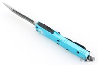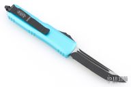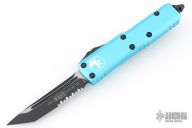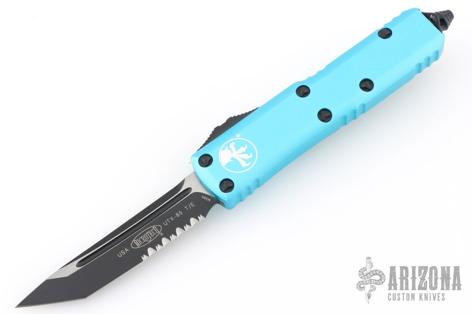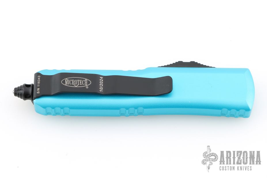 This UTX-85 by Microtech features a black partially serrated tanto blade. The handle has a turquoise aluminum frame with black hardware and tip down clip. Comes with original box and papers. Dated 10/2024 and s/n 116343. Excellent condition.