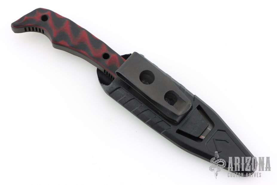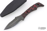 This Dynamis Razorback fixed blade was crafted by Winkler Knives. It features a black spear point blade with sharpened and serrated top edge and notched thumbrest, .182" blade stock and 1" blade depth. The handle is comprised of sculpted black/red G-10 scales over full tang construction. Jimping on pommel provides purchase when holding in the reverse grip. Includes a molded plastic sheath with metal clip. Has some light sheath marks, otherwise excellent condition. Comes with original box, red aluminum trainer and papers.