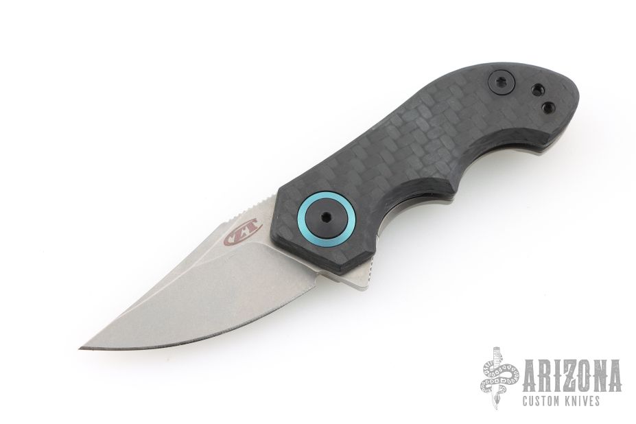 The ZT 0022 is the smallest knife Zero Tolerance has ever produced, and they knocked it out of the park with this impressive Tim Galyean design. This 0022 model is outfitted with a carbon fiber handle with a blue ano titanium pivot collar and a stonewashed 1.8" blade. Meet your latest EDC companion, the 0022 Small Galyean folder from Zero Tolerance Knives. Features CPM-20CV blade steel offers dependable strength and edge retention. Reversible pocket clip for left or right side, tip-up carry. Titanium frame lock with a hardened steel lockbar insert for solid blade lock up. S/N 9157. Excellent condition.