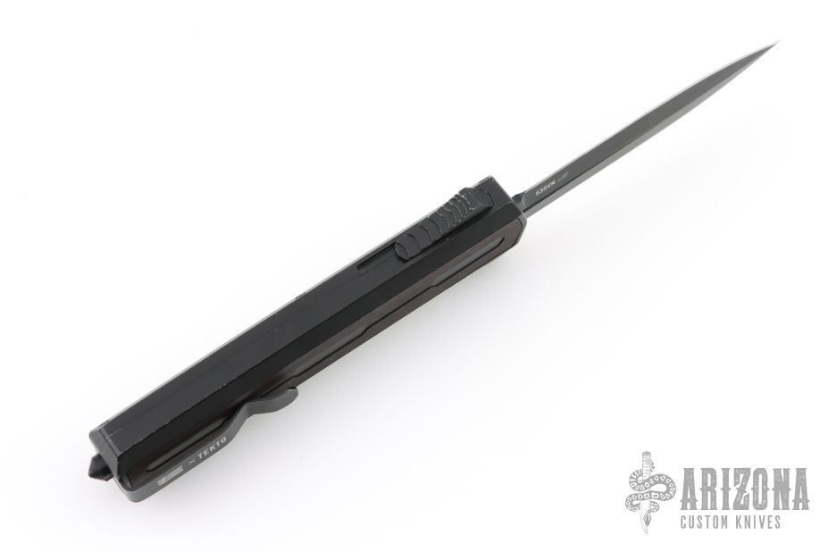 The Tekto A7 Zastava is designed for tactical use, featuring a textured, contoured handle that gives its owner a firm grip. This lightweight automatic knife is equipped with a thumb slide opener, allowing for quick and reliable blade deployment with just a push of a button. Ideal for those who value speed and efficiency in their gear. Has a black aluminum frame with blackwood inlays, black double edged blade. Includes original box and papers. Has some light scuffs and scratches, otherwise good condition.