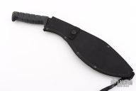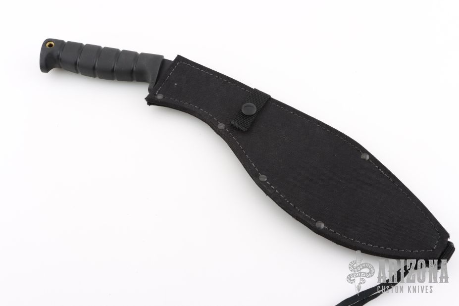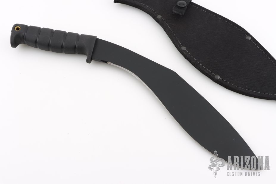 Model - ON6420. Kukri Fixed Blade Knife. 16.75 inch overall. 11.75 inch 1095 carbon steel kukri style blade. Black grooved Kraton handle. Lanyard hole. Black cordura belt sheath with leg ties. Bulk packed. Proudly made in the USA.