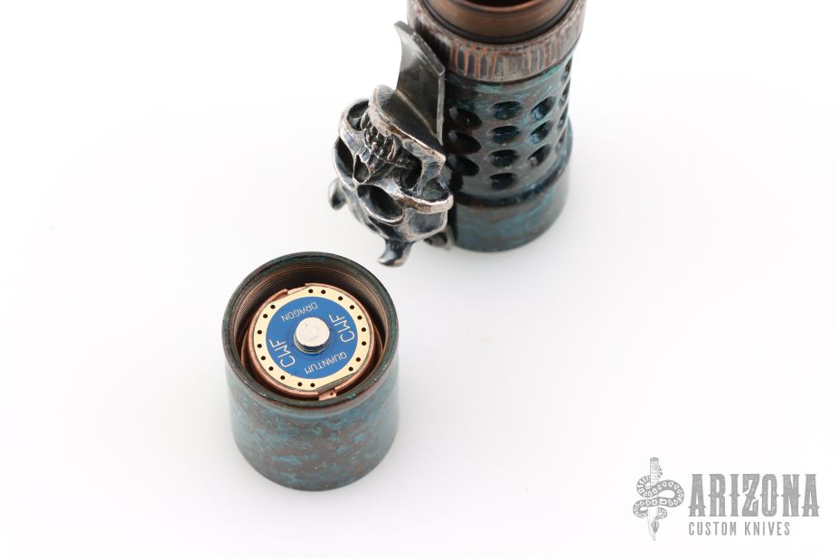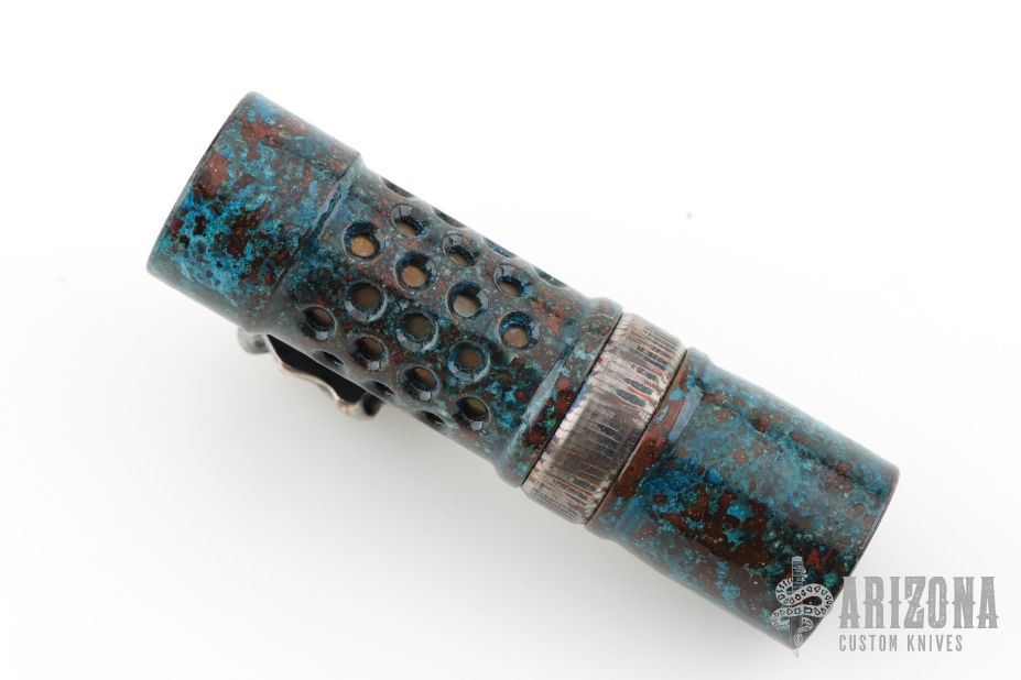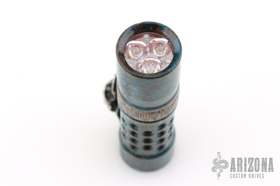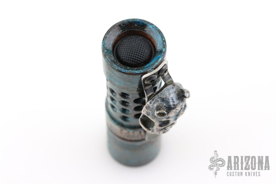 This light from The Barrel Flashlight Company features a Shipwreck patina Copper body, super conductor ring sleeve, and Steel Flame XL Silve Hannya clip. Comes with original titanium clip and copper ring. Quantum Dragon Driver with Nichia 219C 5K with RGB secondaries. Excellent condition.