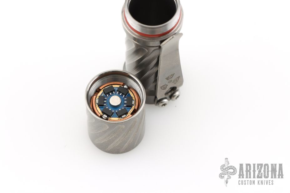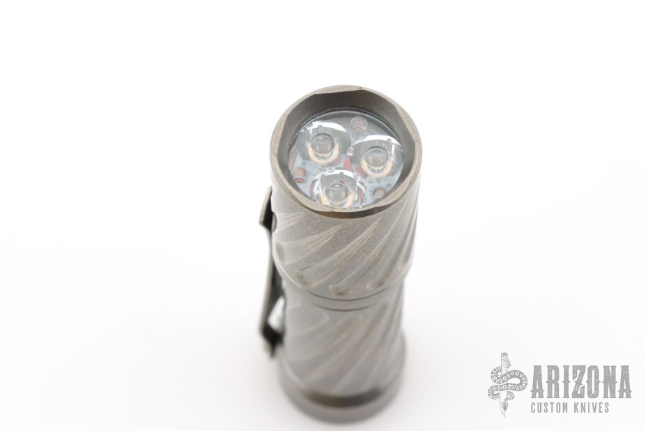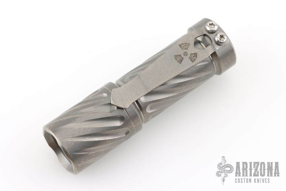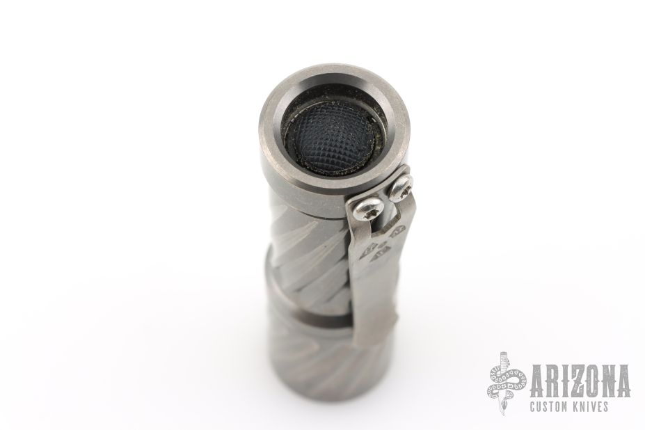 This Twist Trident by Hanko Machine Works is made from titanium, it is stonewashed, has a tip up Steel Flame titanium clip. Comes with a cloth pouch. Excellent condition.