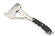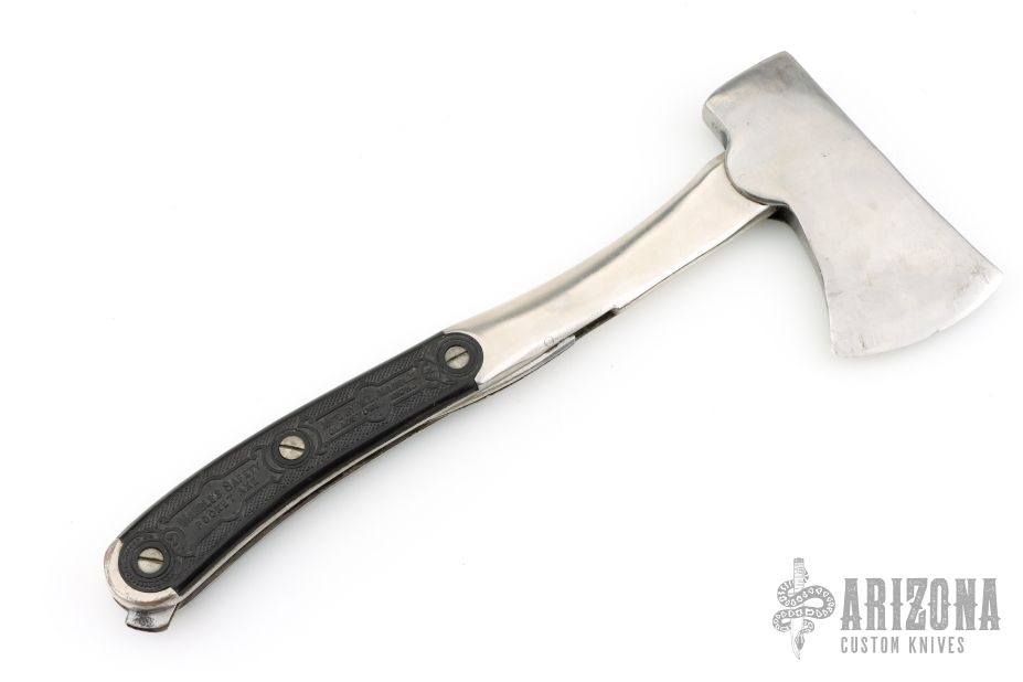 This vintage Marbles MSA Co. Safety Pocket Axe has a couple dings in the blade edge, has correct swing guard, has wear on the finish. The handles are original and correct with original screws. Good overall condition.