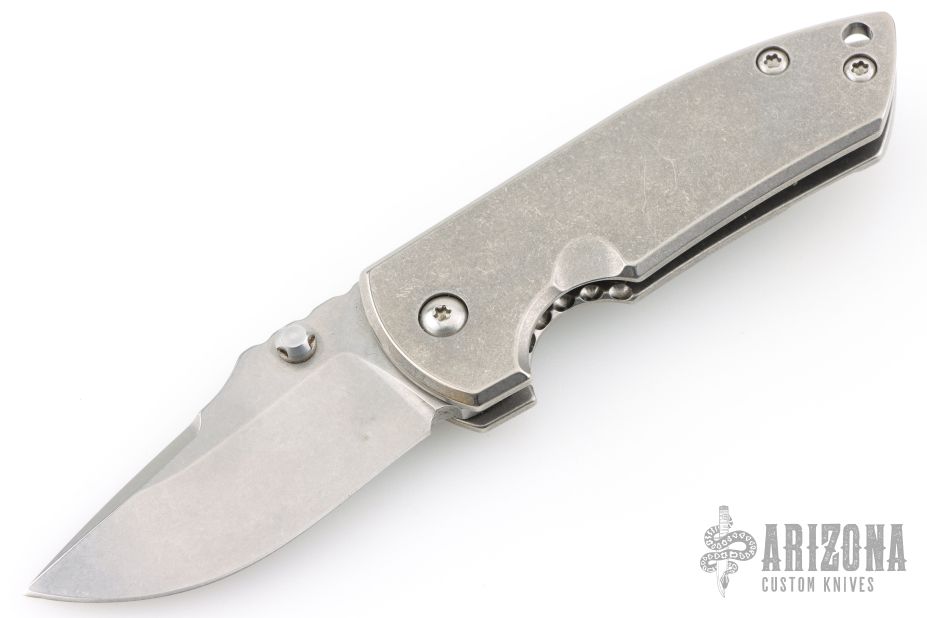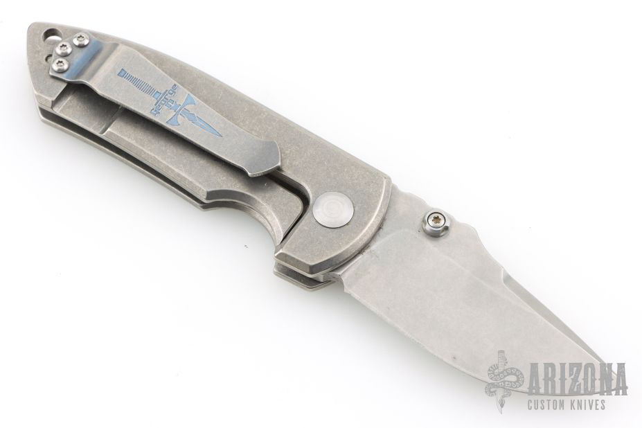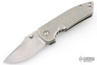 This ESV frame lock by Les George features a stonewashed blade, notched thumb rest and dual thumb studs. Stonewashed titanium frame and pocket clip for tip up carry. Smooth function with a good lock up, blade seating and nice detent. Excellent condition.
