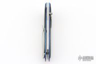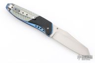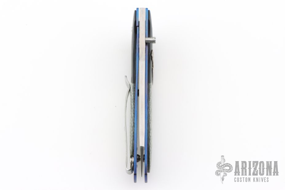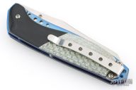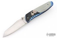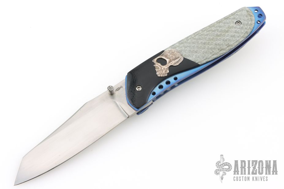 This Linerlock by Stephen Olszewski features a hand rub satin finished blade with a single thumbstud. The handle has black G-10 bolsters and silver twill scales with a hand drawn and sculpted pure silver skull overlay, anodized titanium liners and a tip up stainless steel clip. Nice detent and lockup. Has a few light scratches, otherwise excellent condition. This one was one of the last knives he made before retiring from knife making. Comes with a copy of an email from him stating this.