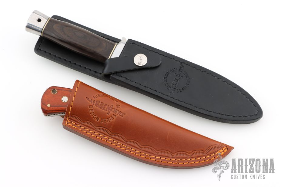Knifemaker extraordinaire Gil Hibben continues to design exceptional knives made for hard everyday use. His Diamondback is a smaller fixed-blade designed to fit comfortably on your side. The knife has a 3 5/8”” full-tang, 7Cr17 steel blade with brass fileworked accents along the tang, extending from a nickel silver bolster with a high-polish finish. The handle scales are a rich, reddish brown pakkawood, accented with detailed mosaic pins and secured with nickel silver pins. The 7 7/8” overall fixed blade slides securely into a premium leather sheath and the handle has a brass lanyard tube.