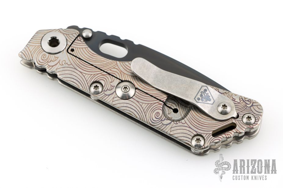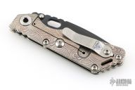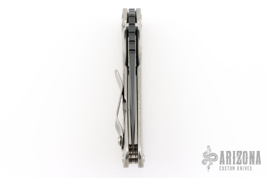 This SnG is a collabrative effort between Prometheus Design Werx and Mick Strider. It features a drop point chromium nitrate finshed blade with thumb hole and notched thumb rest. The handle is comprised of laser engraved and tumbled titanium frame over titanium barrel spacers. Tumbled titanium tip up clip with PDW logo. Excellent condition.