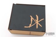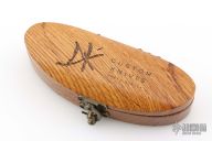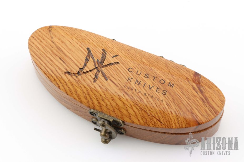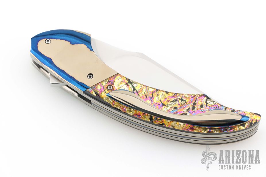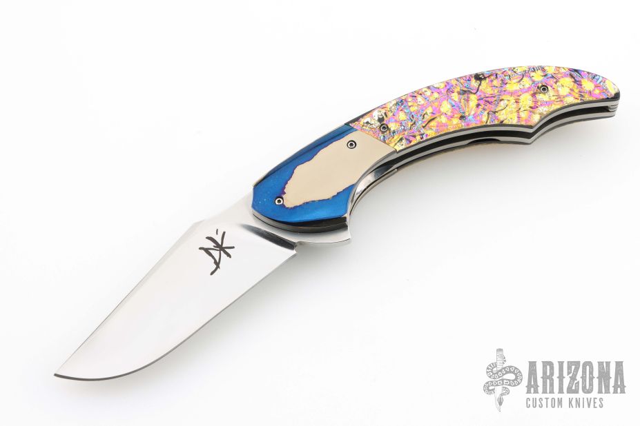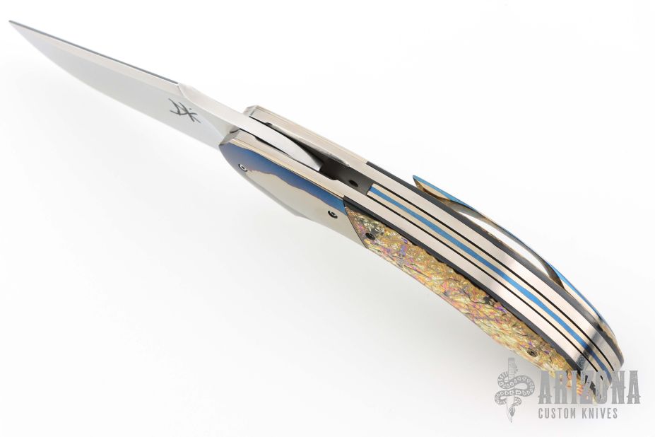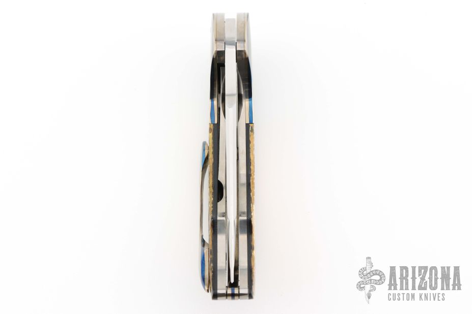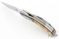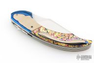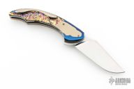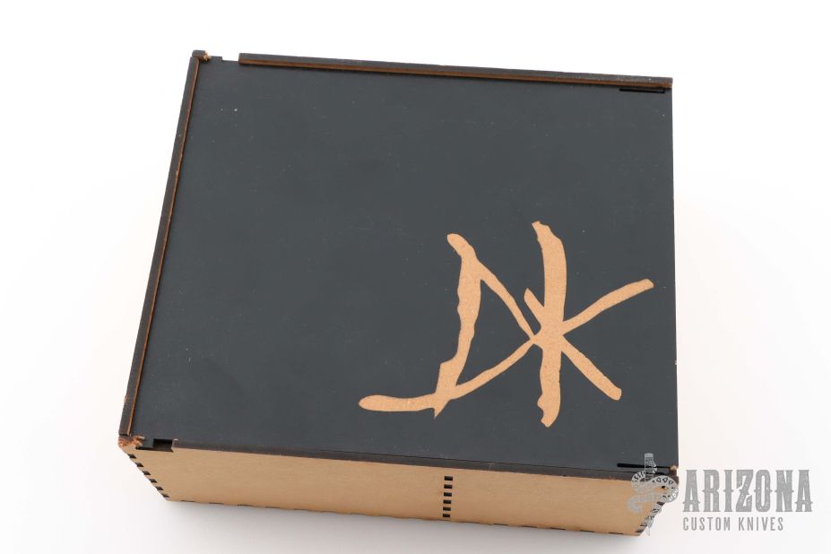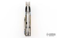 This Hemlock Linerlock Flipper Prototype by Damien Krause features a hand rub satin finished blade with flipper. The handle has San Mai Damascus bolsters, Titanium Burl Dichrolam scales with black liners, satin titanium liners, floating San Mai Damascus backspacer, tip up San Mai Damascus clip with hidden screws. Nice detent, lockup and blade seating. Rides on bearings. Includes original wood display box, Damien Krause Face Mask, outer wooden box, and COA marked #001 Prototype. Excellent Condition.