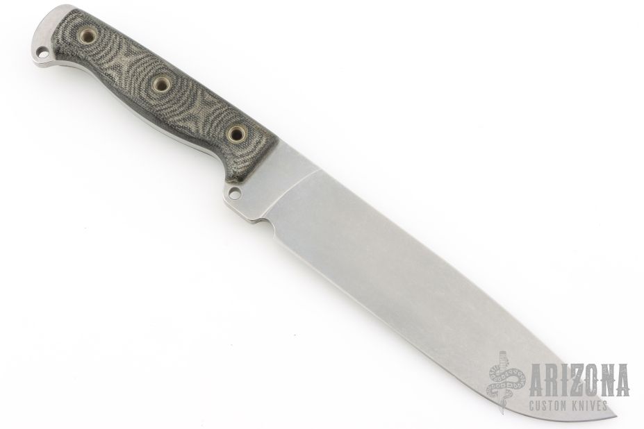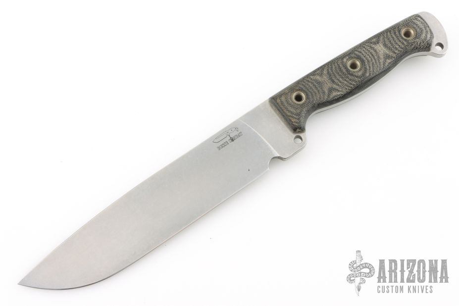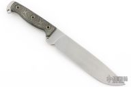 This knife by Busse features a tumble finished drop point blade, .210" blade stock and 1.516" blade depth, full tang construction. The handle has canvas micarta scales with extended tang and lanyard hole. Has a couple light scratches, otherwise Excellent condition.