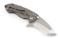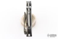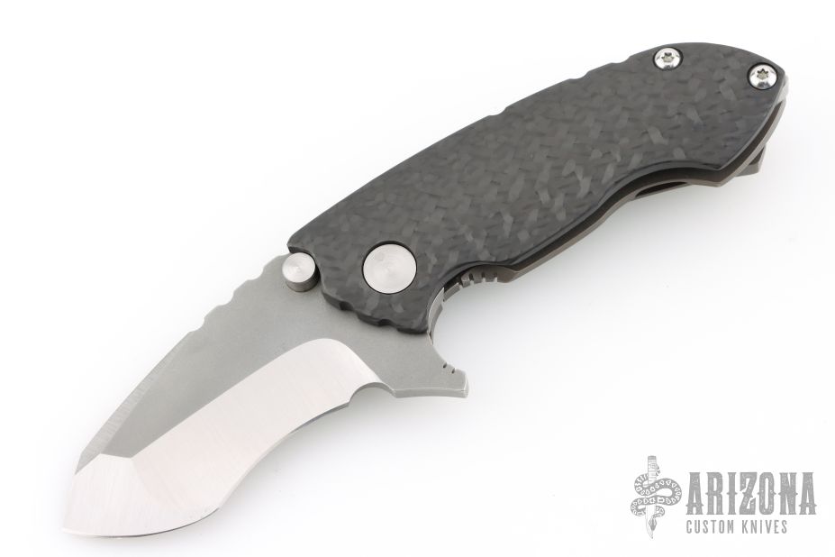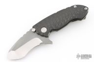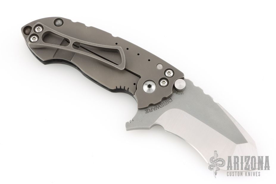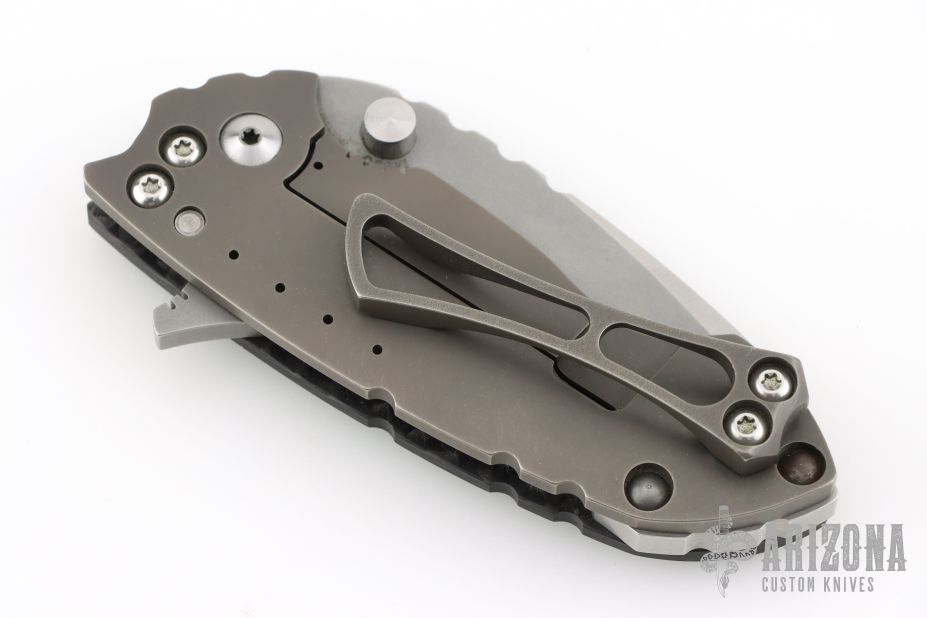 This S90 framelock flipper from Direware Knives features a two-tone finished blade with notched thumbrest and flipper, .188" blade stock. The handle has a carbon fiber and tumbled and anodized titanium frame and matching pocket clip. Nice detent, lockup and blade seating. Clip can be positioned for tip up or tip down carry. Excellent condition. Comes with a zippered case.