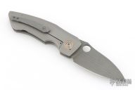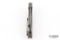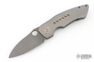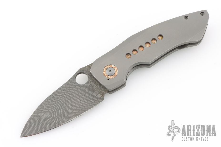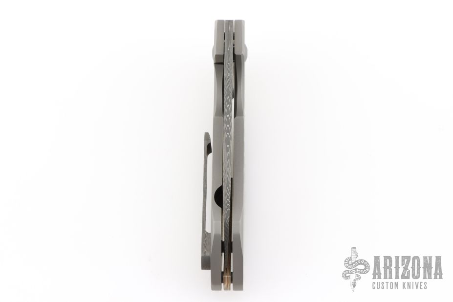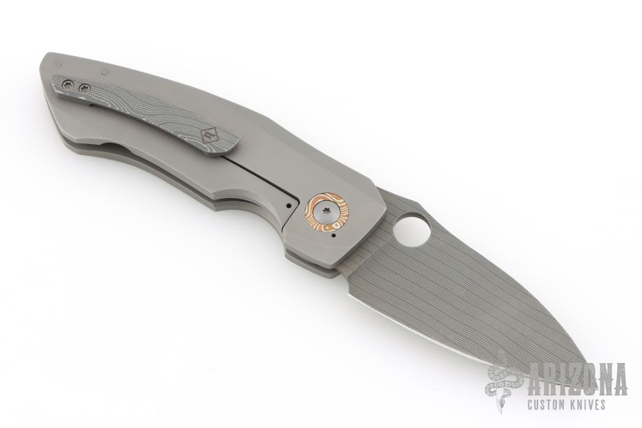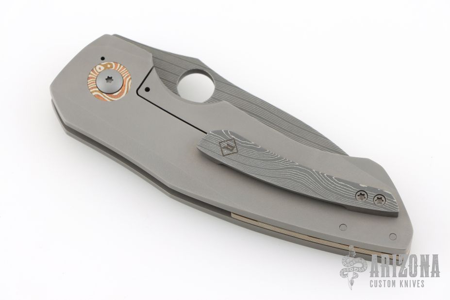 This CU-X Framelock by Mark Roe features a Chad Nichols Bacon Damascus blade with thumbhole. The handle has a bead blasted titanium frame with Chris Ploof Mokume pivot collars, inlays and floating backspacer, Damascus tip up clip. Rides on bearings, nice detent, lockup and blade seating. Comes with zippered case and COA dated 10/21/20. Excellent condition.