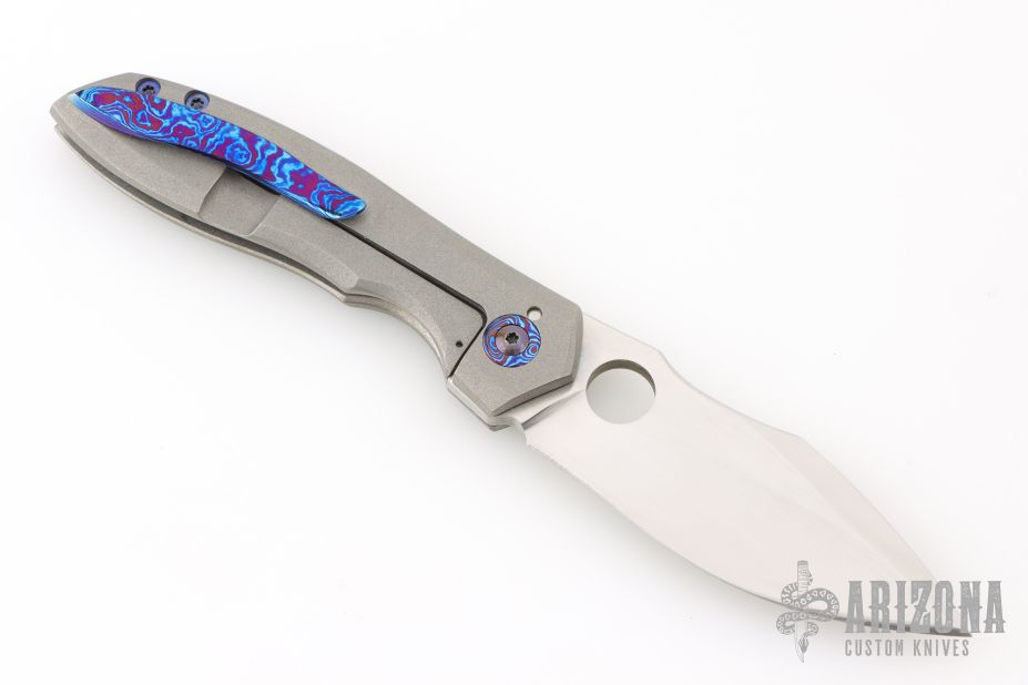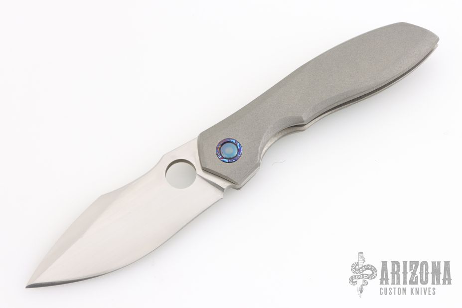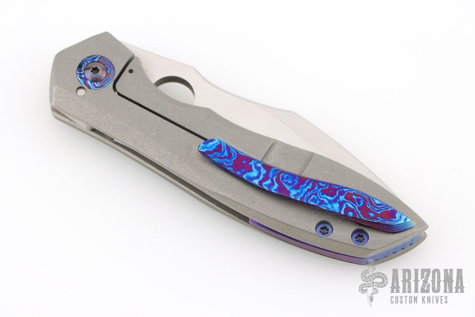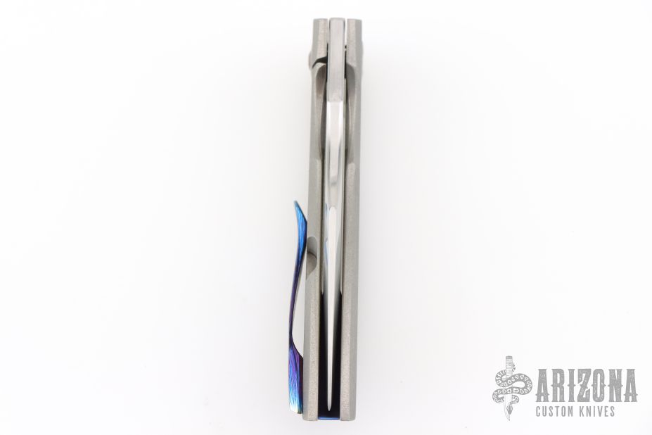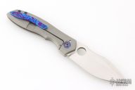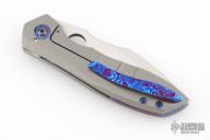 This Continuum Variant One Off by Tuff Knives features a hand rub satin finished blade with a thumbhole. The handle has a bead blasted titanium frame, Timascus tip up pocket clip with hidden screws, timascus pivot collars, anodized titanium backspacer. Nice blade seating, lockup and nice detent. Rides on bearings. Includes a COA dated 2020. Has a couple extremely light scratches, otherwise excellent condition.