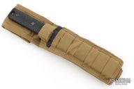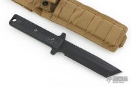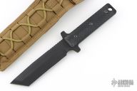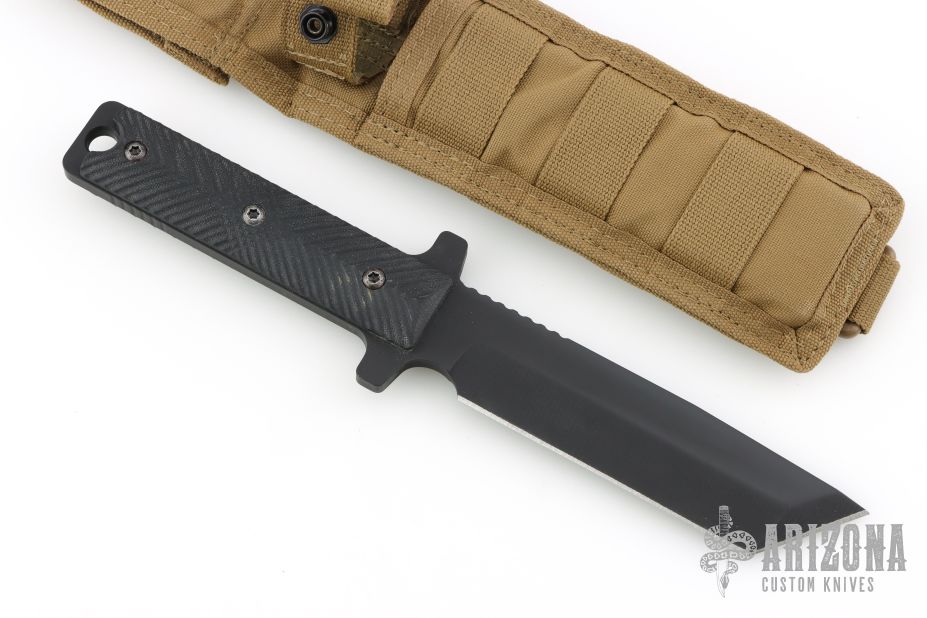 This fixed blade is the model which the military purchases from Mr. George. It has a black tanto blade with notched thumbrest and machined bevels, .259" blade stock and 1.404" blade depth, full tang construction. The handle has black G-10 scales. Includes an FDE nylon sheath. Nice heavy duty knife, made for use!! Excellent condition, has some light sheath scuffs.