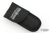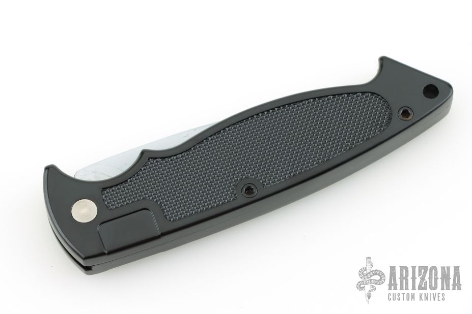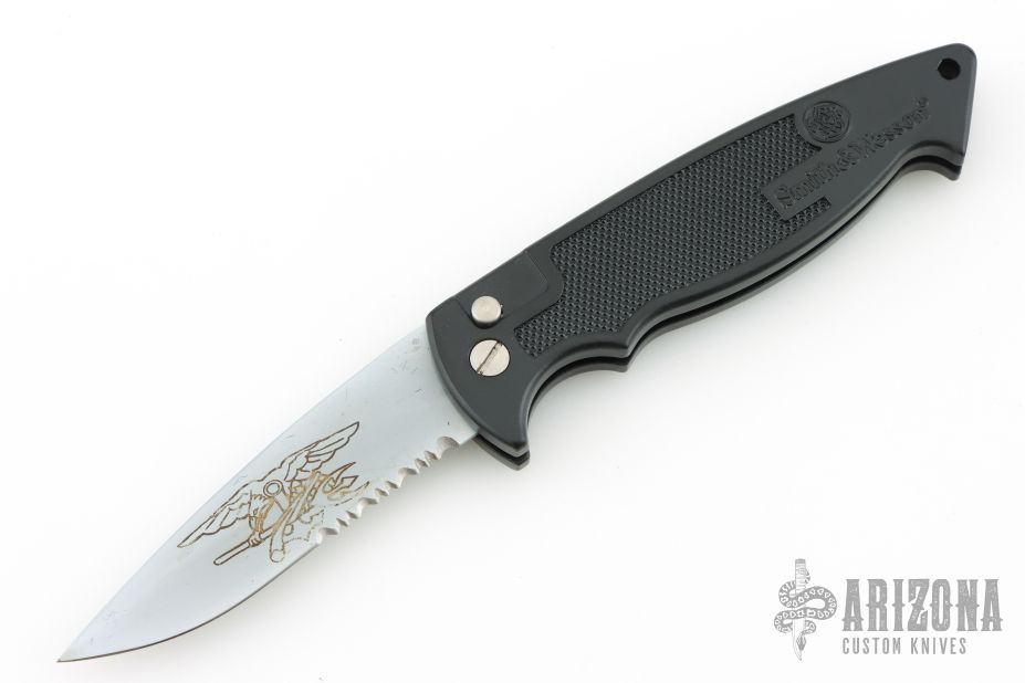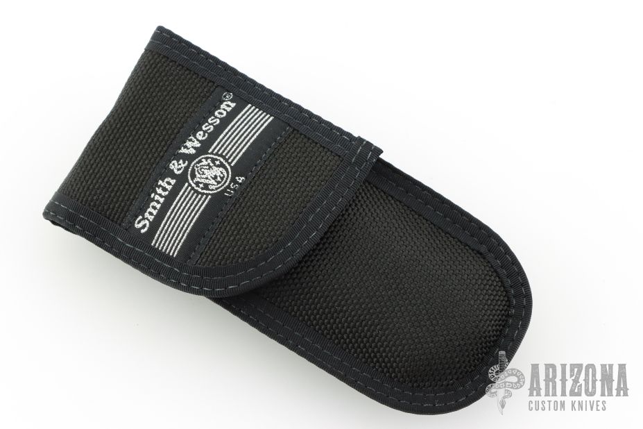This auto from Smith & Wesson has a bead blasted blade with false top edge and partial serrations. Black aluminium handle. Comes with original box and nylon belt sheath. Has some light scuffs, scratches, otherwise excellent condition.