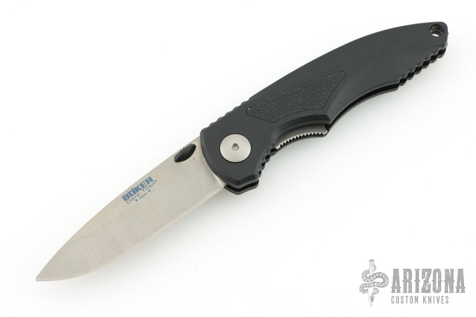 This Boker liner-lock folder features a silver color ceramic blade with a thumbstud. The handle has a black FRN frame, a stainless steel liner and pocket clip, tip down carry. Comes with original box and papers. Has a few very light scuffs, and scratches, otherwise the knife is in excellent condition.