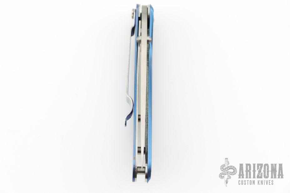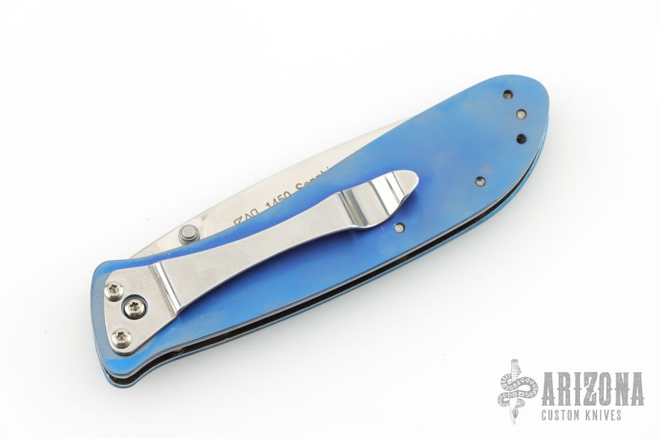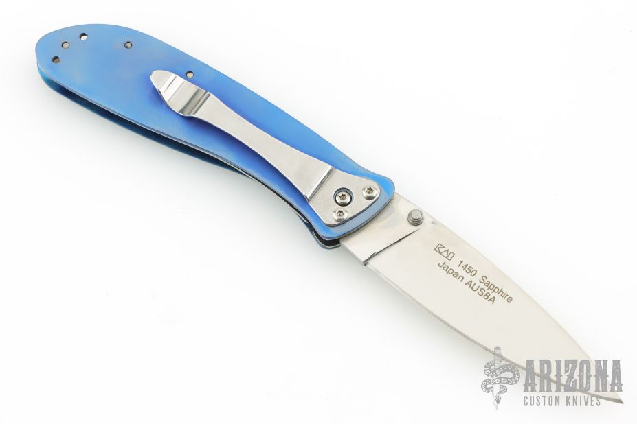 This 1450 Sapphire is a discontinued model. Satin finished drop point blade with dual thumbstuds. The handle has a milled and anodized titanium frame with tip up or down reversible stainless steel clip. Nice detent, lockup and blade seating. Comes with original box and papers. Excellent condition.
