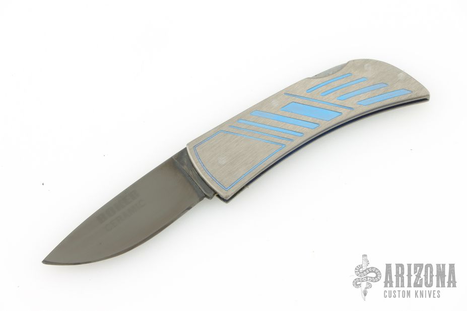 This ceramic lockback by Boker Knives features a ceramic drop point blade. The handle is comprised of anodized and satin finished titanium covers, and a steel rocker bar. Comes with original clamshell style box, papers, and outer paper sleeve. Excellent condition.