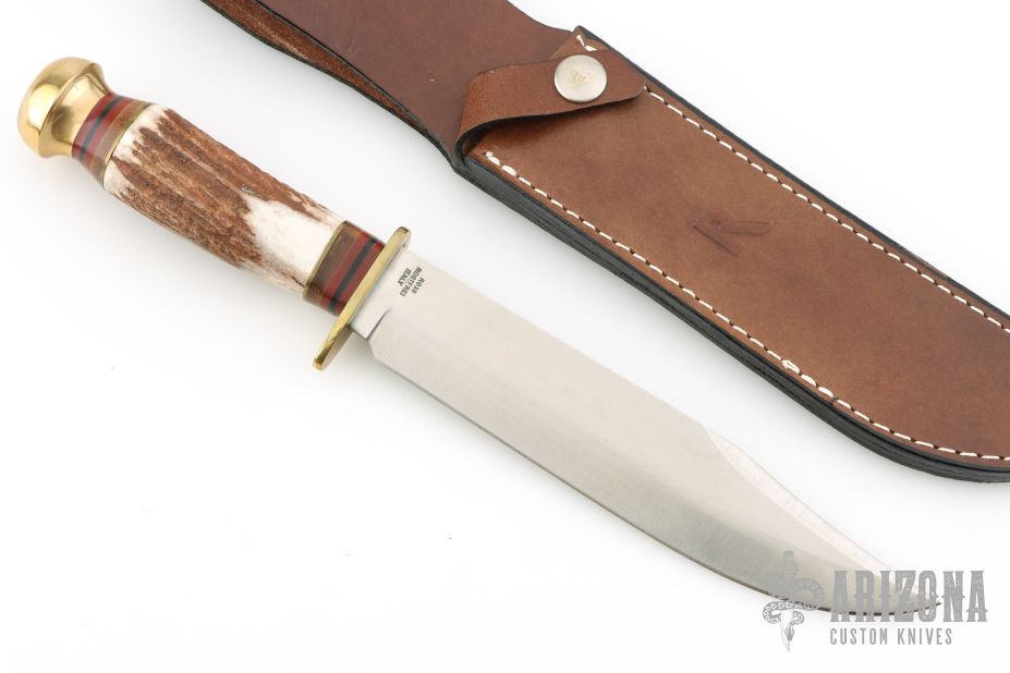 This Bowie from Rigid Knives features a satin finished blade with a false top edge, .178" blade stock and 1.303" blade depth, hidden tang construction. The handle has a brass guard and butt with stag grip and red/black/brown/brass spacers. Comes with original box and brown leather sheath. Has a couple light scratches and a light patina, excellent condition otherwise.