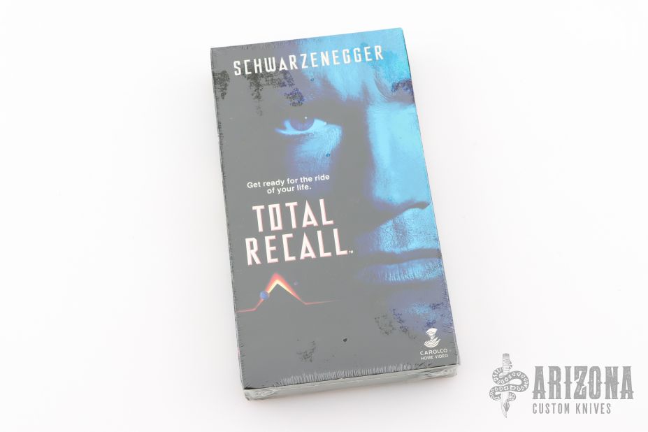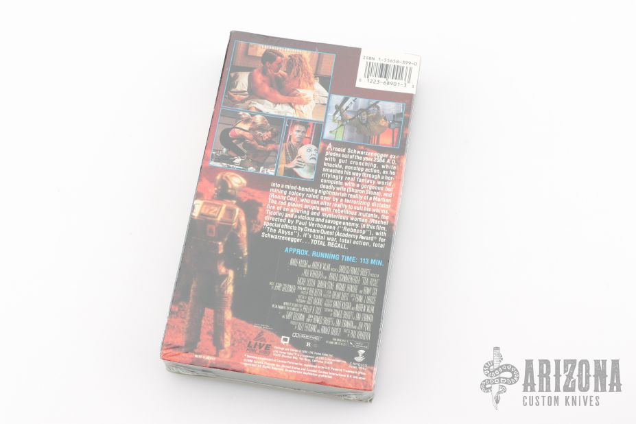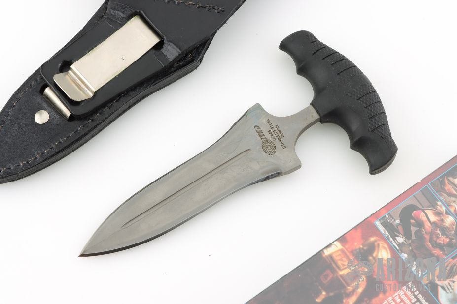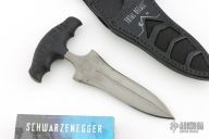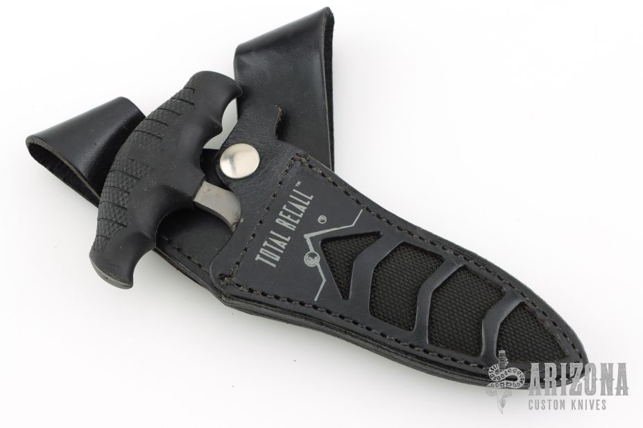 This Push Dagger by United Cutlery was used in the movie "Total Recall". It features a bead blasted double edged blade with fullers, .227" blade stock and 1.648" blade depth, hidden tang construction. The handle is rubber. Comes with original box, papers, leather sheath, and sealed VHS copy of the movie Total Recall. Has some scuffs and scratches, great condition overall.