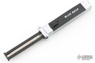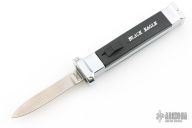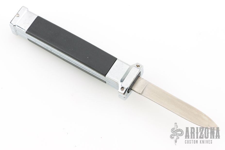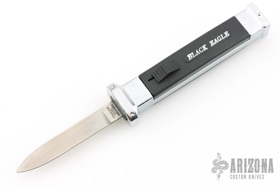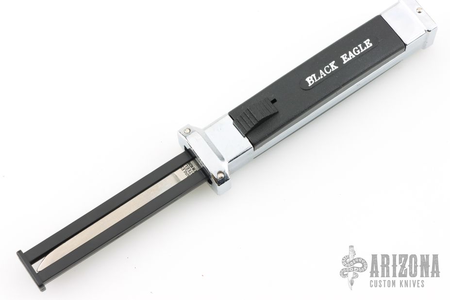 Unusual automatic by Black Eagle, where the blade is fixed and the release button retracts the guard. Polished drop point blade. Comes with original box, and sheath. Has a couple light scratches, otherwise excellent condition.