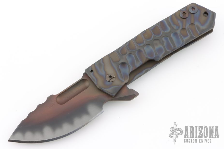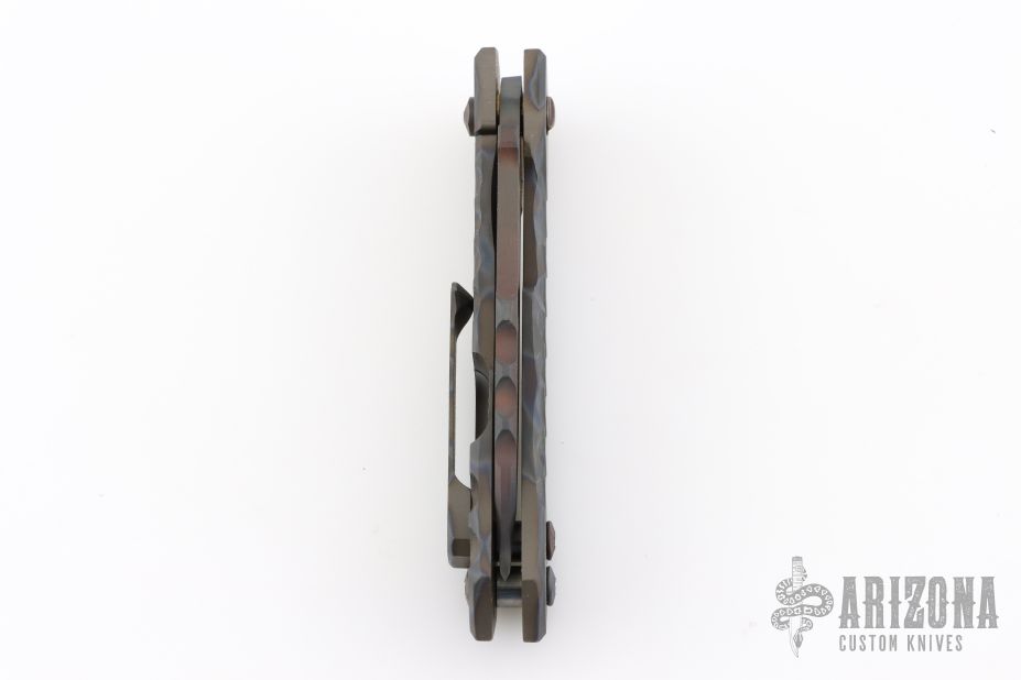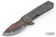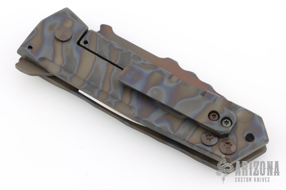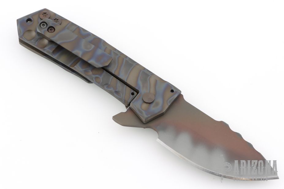 This FIFP (Fear is For Prey) framelock flipper by Crusader Forge features a phantom finished drop point blade with fuller and flipper.  The handle features a milled FR38Ti AP titanium frame with flame anodized finish, and a matching tip up pocket clip. Comes with original box and COA. One of One. Excellent condition.
