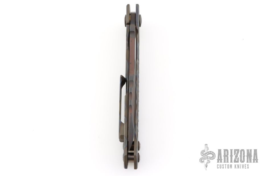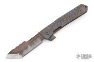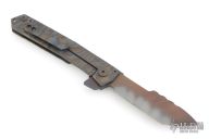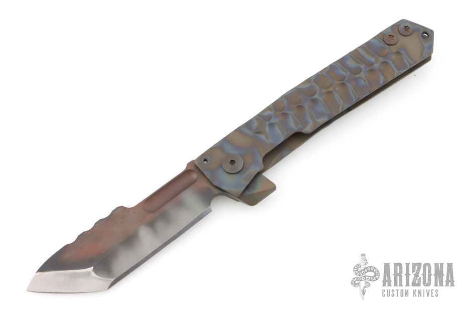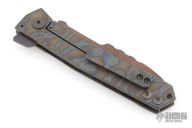 This FIFP Excaliber framelock flipper is the monster version of the popular FIFP. This one features a phantom finished tanto blade with fuller and flipper. The handle has a milled titanium frame with a flamed finish and a matching titanium clip. Smooth action. Nice lockup, detent, and seating. Very nice work. Comes with original box and COA. One of One. Excellent condition.