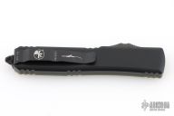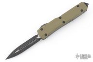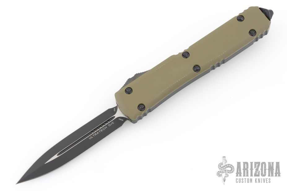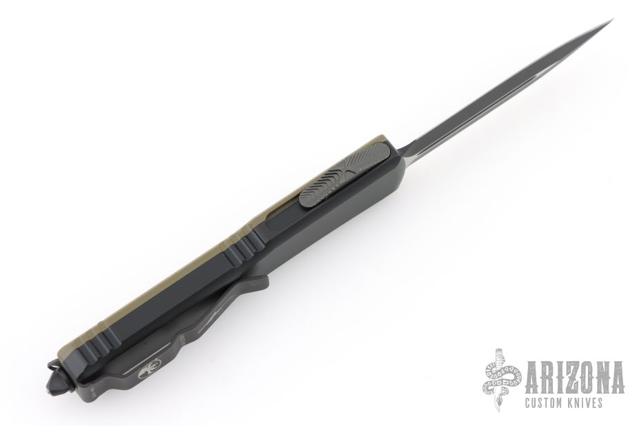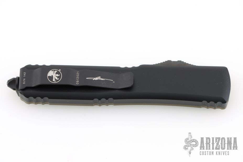 This Ultratech by Microtech features a black double edged blade with fullers. The handle has a contoured green G-10 and black aluminum frame with black stainless steel hardware and tip down clip. Comes with original box and papers. Excellent condition. Dated 09/2021 and s/n 142.