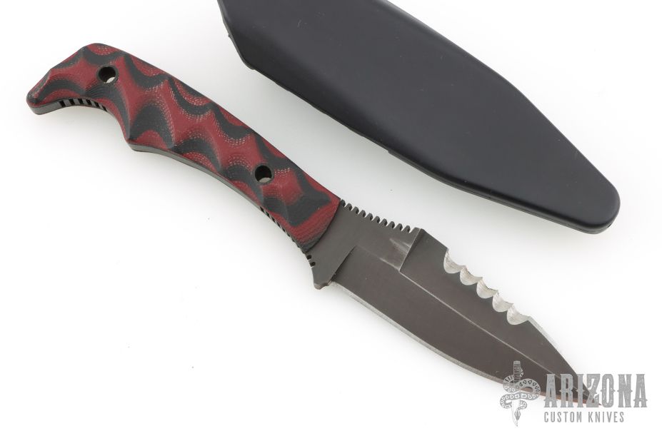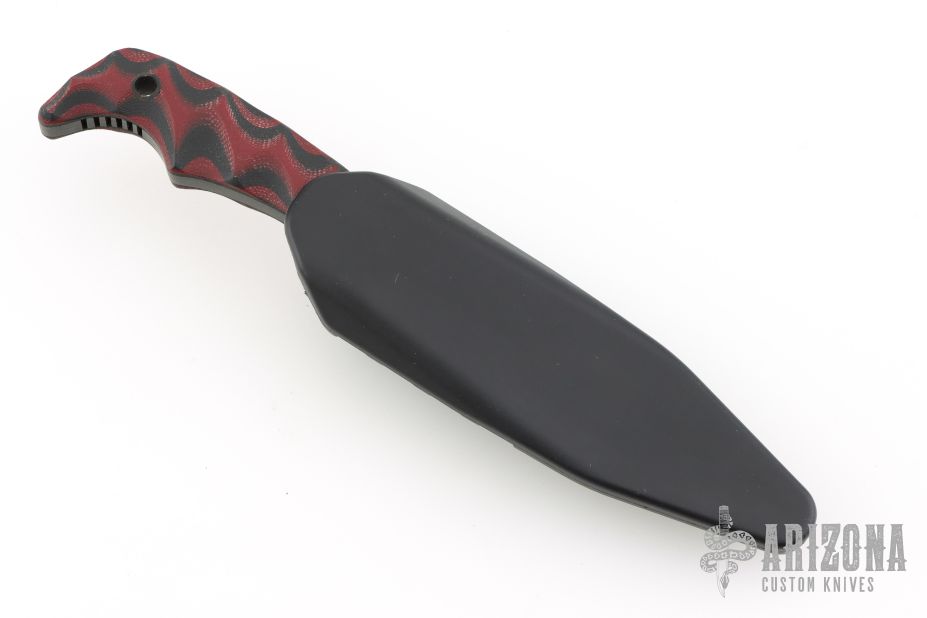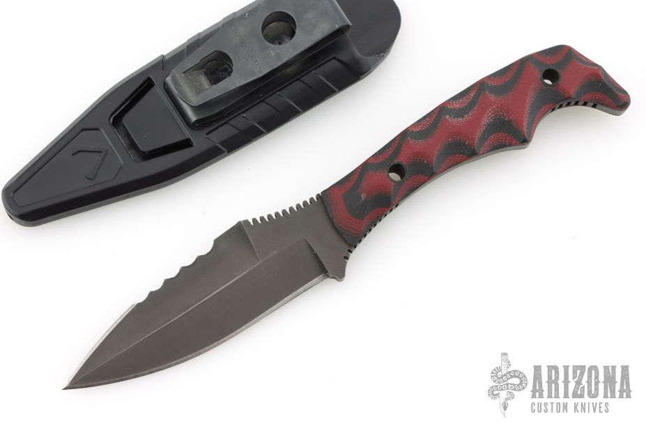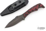 This Dynamis Revere fixed blade was crafted by Winkler Knives. It features a black spear point blade with sharpened and serrated top edge and notched thumbrest, .188" blade stock and 1.054" blade depth. The handle is comprised of sculpted black/red G-10 scales over full tang construction. Jimping on pommel provides purchase when holding in the reverse grip. Includes a molded plastic sheath with metal clip. Has some sheath scuffs, otherwise excellent condition.