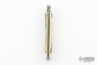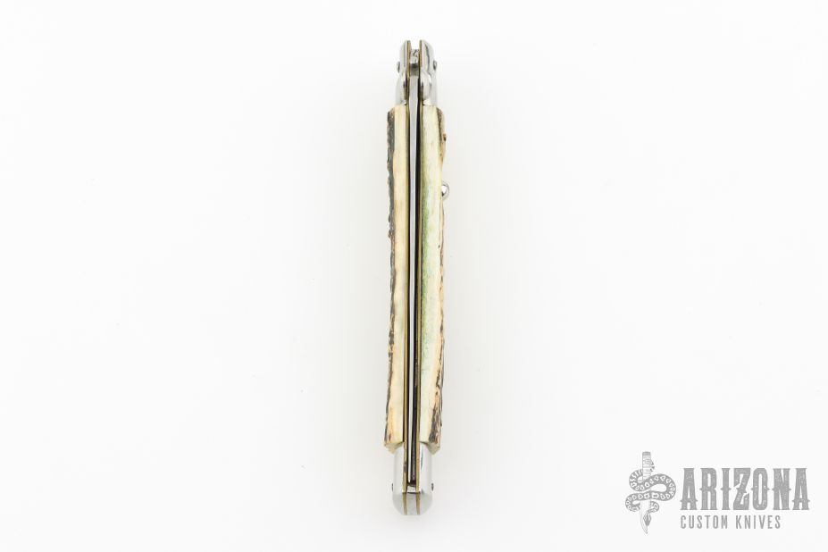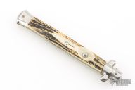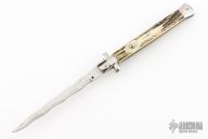 This Swivel Bolster from Stiletto Italy features a kris ground blade with false top edge. The handle is comprised of stainless steel bolsters and pommel with stag scales over brass liners and stainless steel backspacer. Has a few light scratches, otherwise excellent condition.