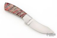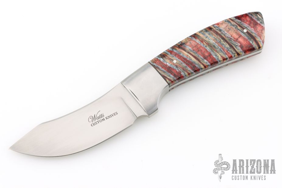 This Skinner by Rod Watts features a hand rubbed satin finish blade with .155" blade stock, 1.206" blade depth, full tang construction. The handle has satin finished 416 stainless steel bolsters and pins, mammoth tooth scales, black liners, spine of tang is fileworked. Excellent condition. Comes with nylon zippered case.
