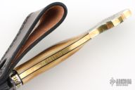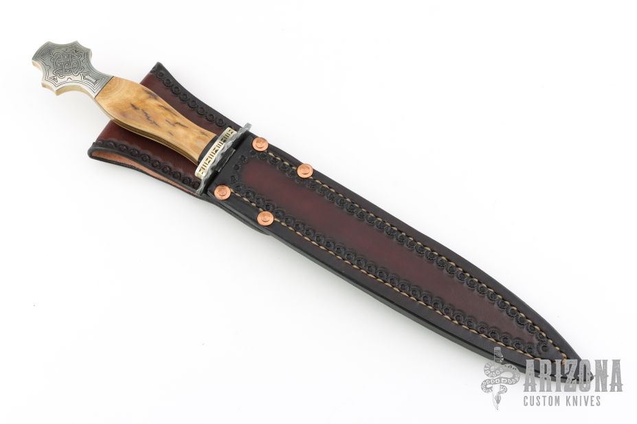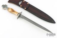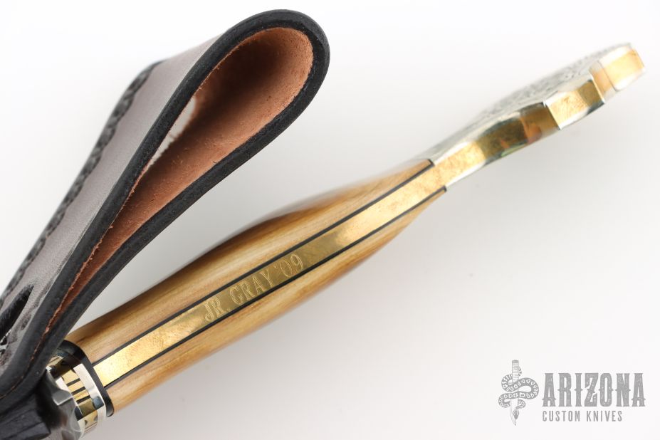This fixed blade by JR. Gray features a 224 layer Ladder Damascus double edge blade with .183" blade stock and .872" blade depth, hidden/frame tang construction. The handle has a fileworked Damascus guard with nickel silver and fileworked brass spacers, mammoth ivory scales with black liners, has a brass frame, and engraved nickel silver rear bolsters. Engraving done by Linda Doyle. Includes a hand tooled brown leather sheath with belt loop and copper rivets. Also includes signed COA from maker. "JR. GRAY '09" on the frame/tang.