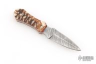 This Mini Dagger by Mark Macfarlan features a 125 layer Twist Damascus double edged blade with .125" blade stock and .671" blade depth, full tang construction. The handle has tiger coral scales with red liners and mosaic pins. Excellent condition.