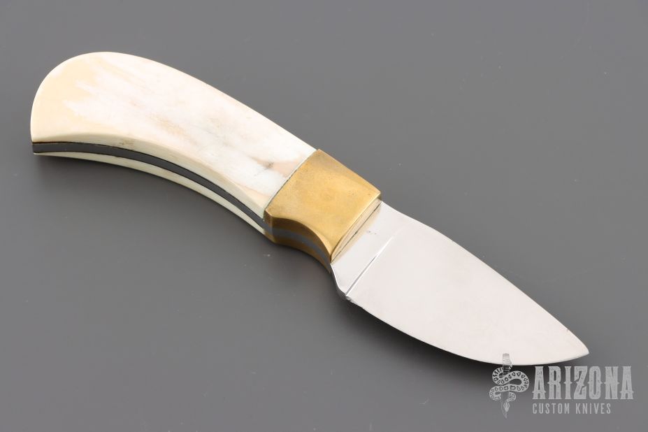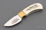 This knife by Larry Galligher features a mirror polished blade with .137" blade stock and 1.020" blade depth, full tang construction. The handle has brass bolsters, mammoth ivory scales and black liners. The handle has been scrimshawed with a boat/whale breach scene. Has some chips in one of the scales, has a couple light scratches, otherwise good condition.