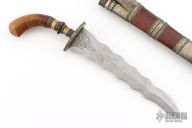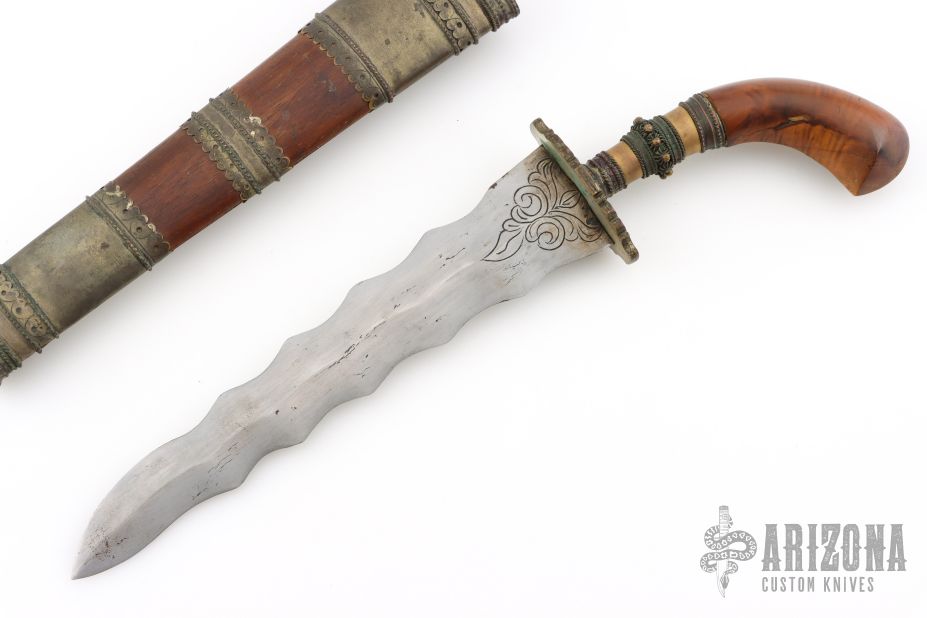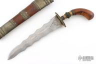This antique Kris Dagger features a double edged blade with carved ricasso, .154" blade stock and 1.708" blade depth, hidden tang construction. The handle has a brass spacer, and wood grip. Comes with a beautiful scabbard with matching wooden throat and engraved nickel silver scabbard. Has some scratches on the sheath and some oxidation on the blade, otherwise good condition. Slight crack in the handle. Very interesting piece.