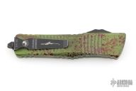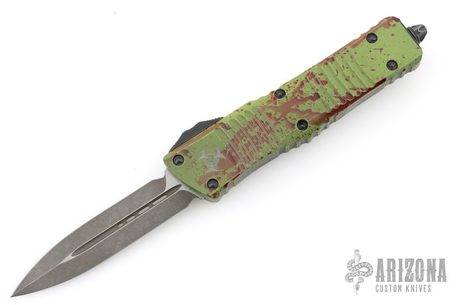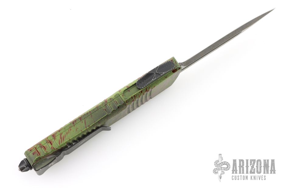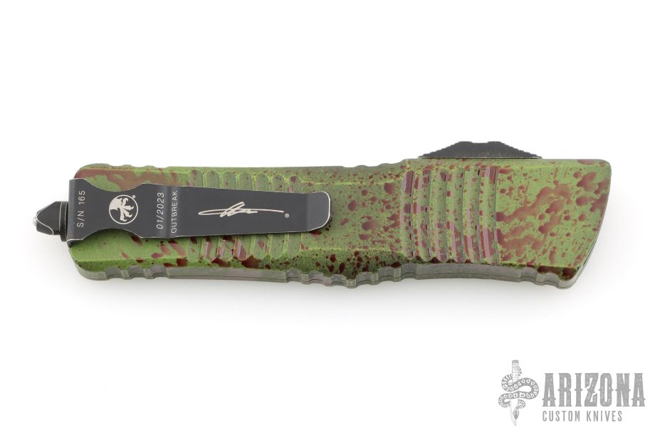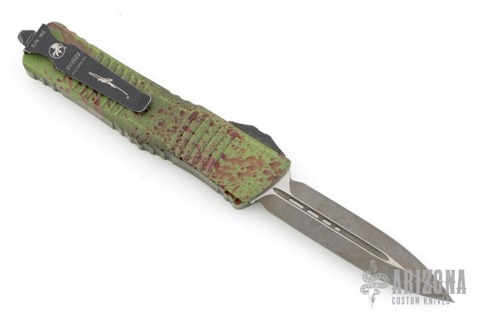 This Combat Troodon OTF automatic by Microtech knives features a double edged blade, and an aluminum handle with black hardware, tip down carry. Glass breaker. S/N 165. Dated 01/2023. Comes with original box and papers. Excellent condition.