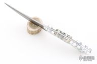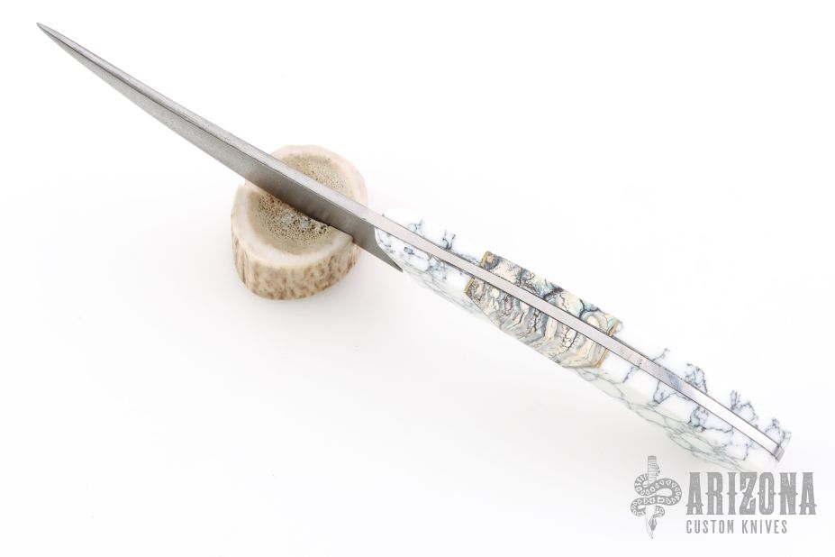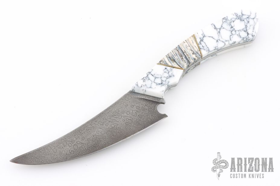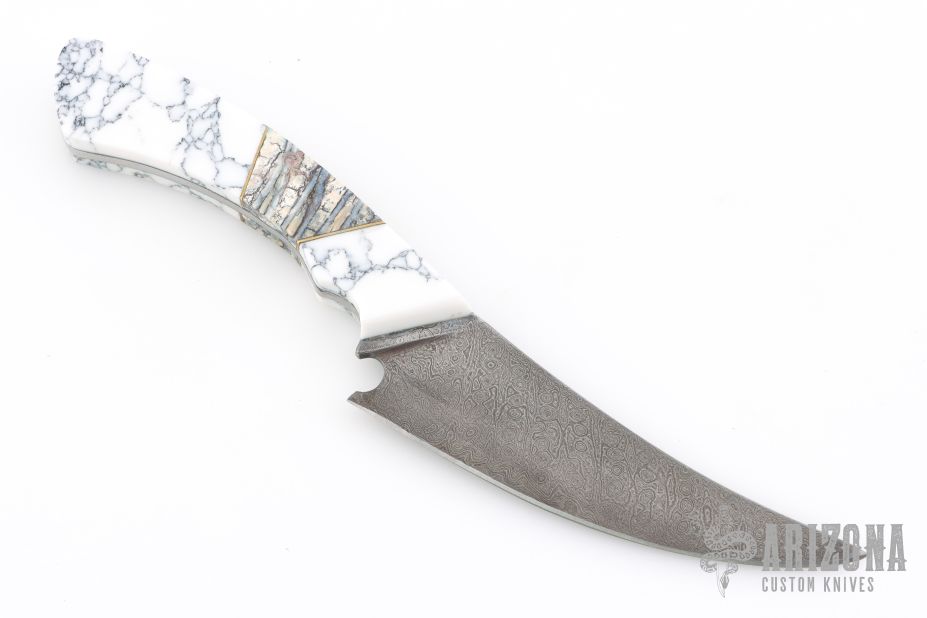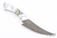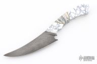 This Skinner by Bill Akers of Backwoods Custom Knives features Damascus blade with .167" blade stock and 1.674" blade depth, full tang construction. The handle has white tuquoise scales with brass and mammoth tooth spacers. Has a couple light scratches, otherwise good condition.