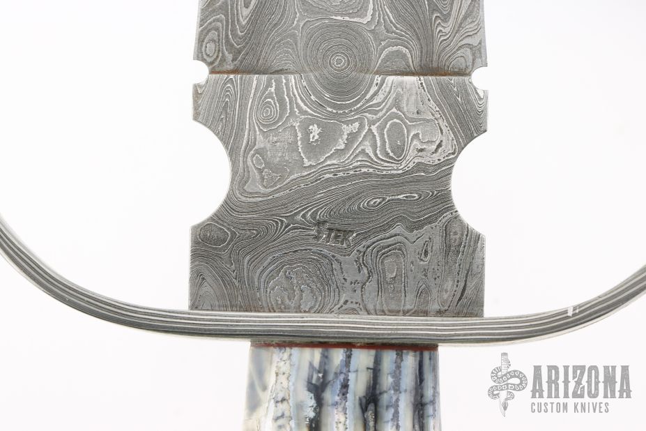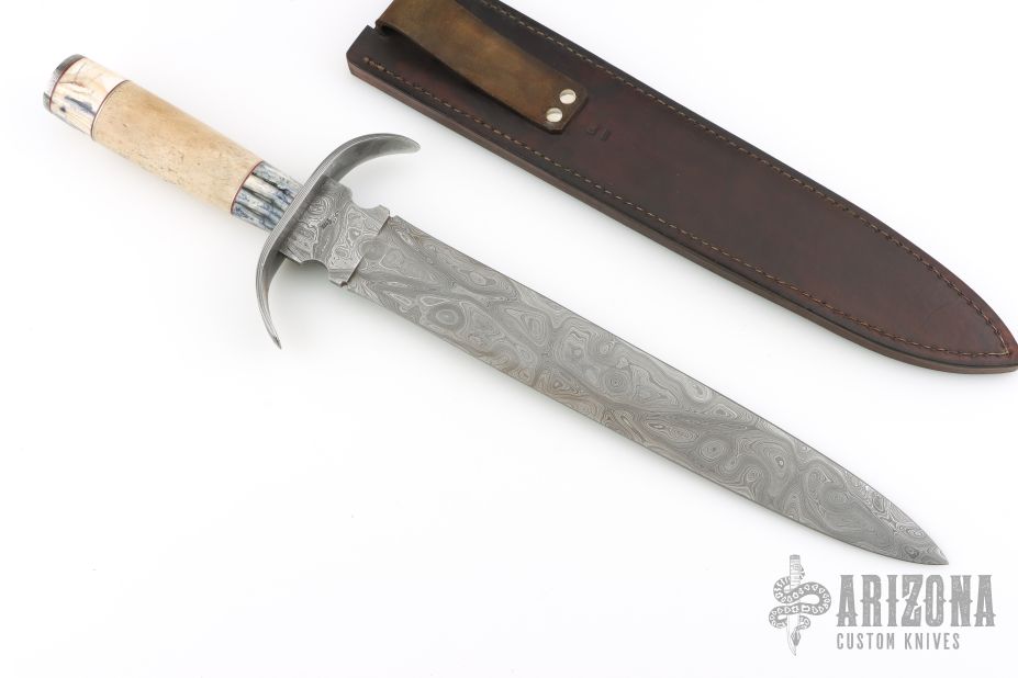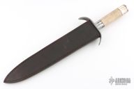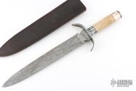 This Short Sword from Stek Knives features a 360 layer Pool and Eye Pattern Damascus double edged blade with .248" blade stock and 1.975" blade depth, hidden tang construction. The handle has a Damascus forward curved guard, ancient fossilized oosic grip, mammoth tooth/red/nickel silver spacers with a Damascus pommel. Includes a brown leather sheath and COA dated Feb 2007. Excellent condition.