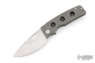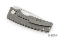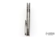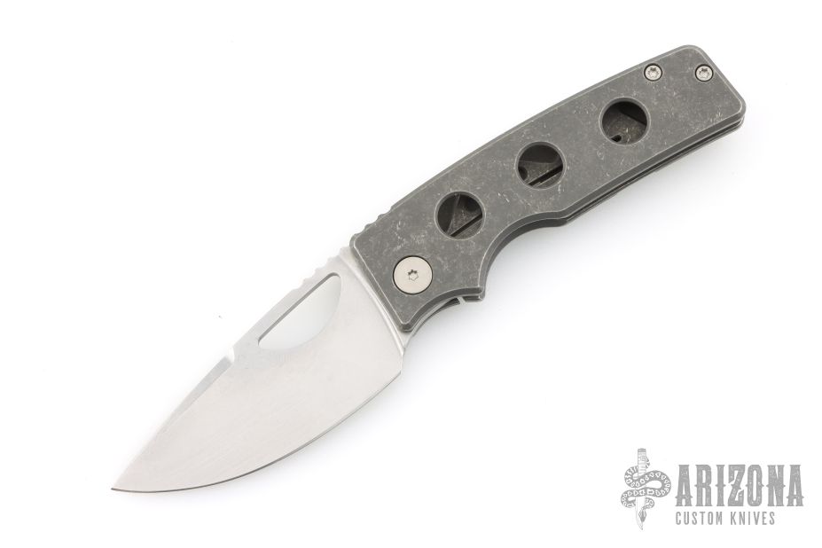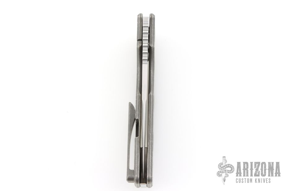 This knife by the OZ Machine Company features a tumbled Magnacut blade with thumbhole and notched thumbrest. The handle features a tumble finished titanium frame with a matching titanium backspacer and tip up clip with hidden screws. Includes box and papers dated 3-5-24 and s/n 3081. Excellent condition.